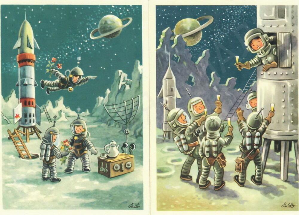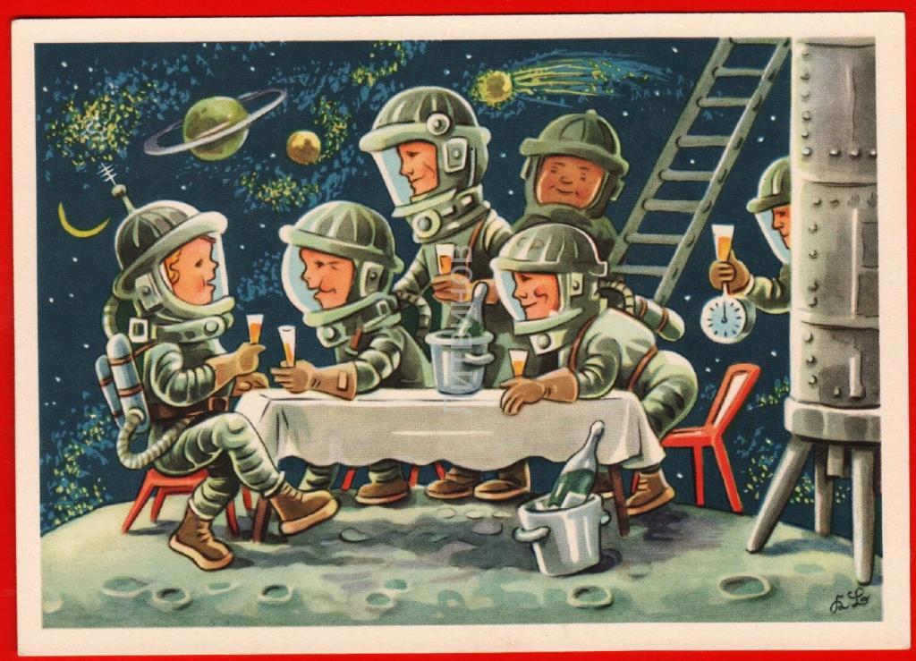 А еще я вам открыток советских нашла, тематических. Вот только у меня один вопрос возникает, когда я на них смотрю: каким образом у них шампанское внутрь-то попадает? Там дырка специальная в скафандре есть, или как?