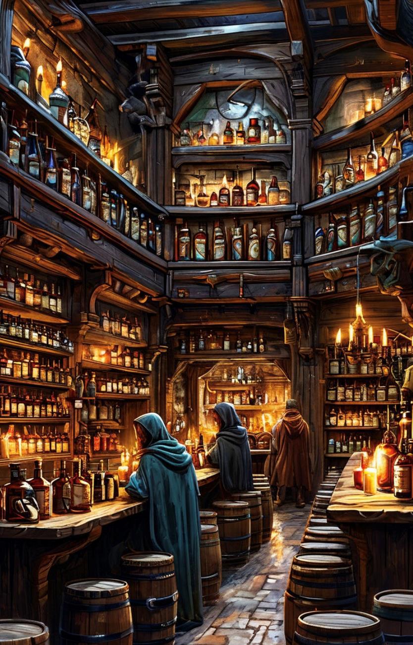 На столах томились различные яства, источающие дразнящий аромат: козий сыр со специями, печеные овощи, салаты с горчичной заправкой и копченая рыба, поблёскивающая своей гладкой чешуёй в теплом свете волнующихся свечей. Жареные грибы лежали рядом с томленым на углях картофелем, а за их широкими блюдами спрятались румяные пироги с ягодами. Соления в небольших бочонках покоились на полу, когда полки таверны были уставлены множеством склянок с разноцветными зельями. В душном полумраке Каиса смогла разобрать несколько надписей на них: «Морская пена», «Проклятие троллей», «Прыть русалки» и «Сила волколака».