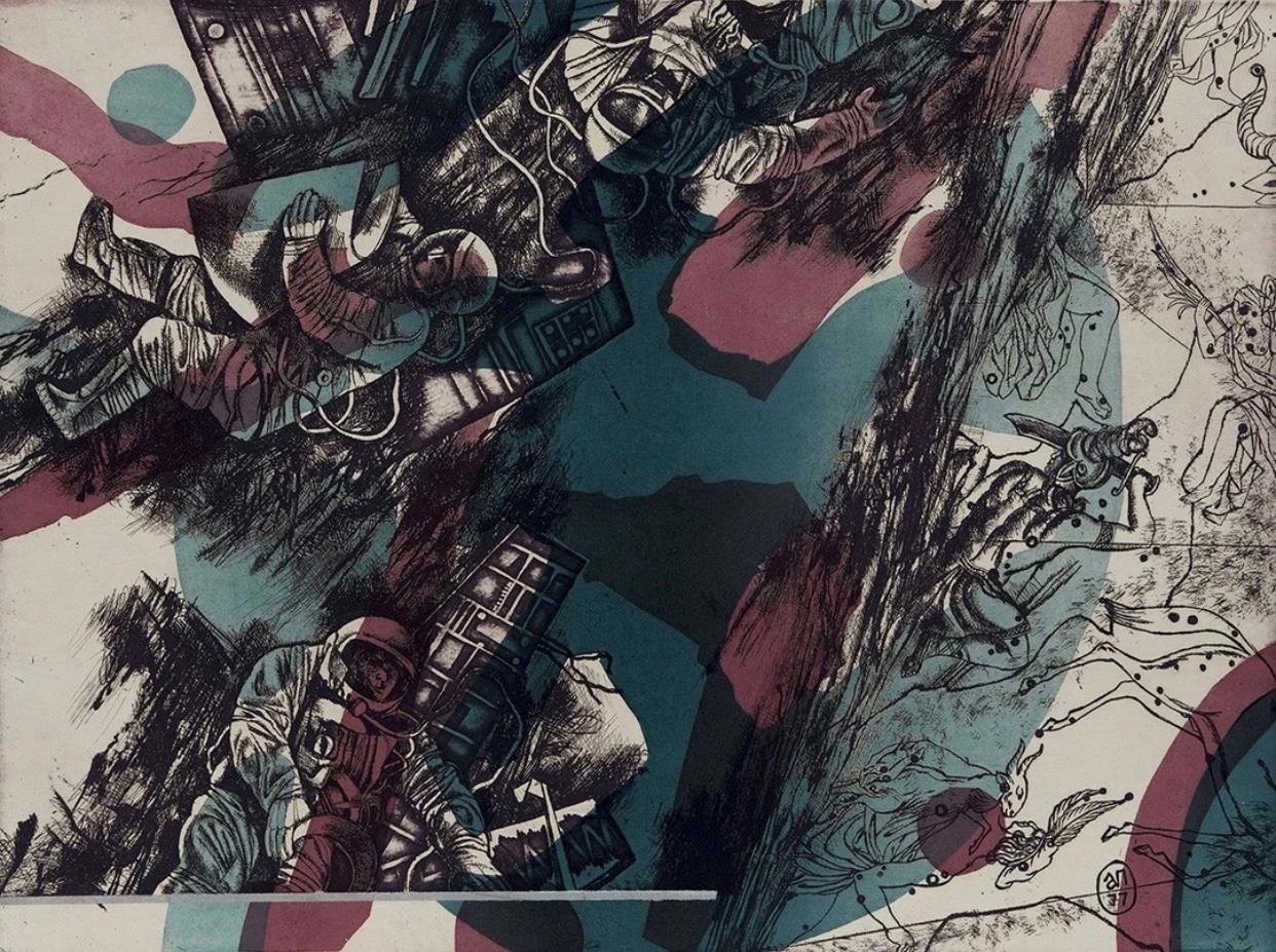 В качестве художественного оформления использована картина Анатолия Плахова В открытом космосе. 1977 год.