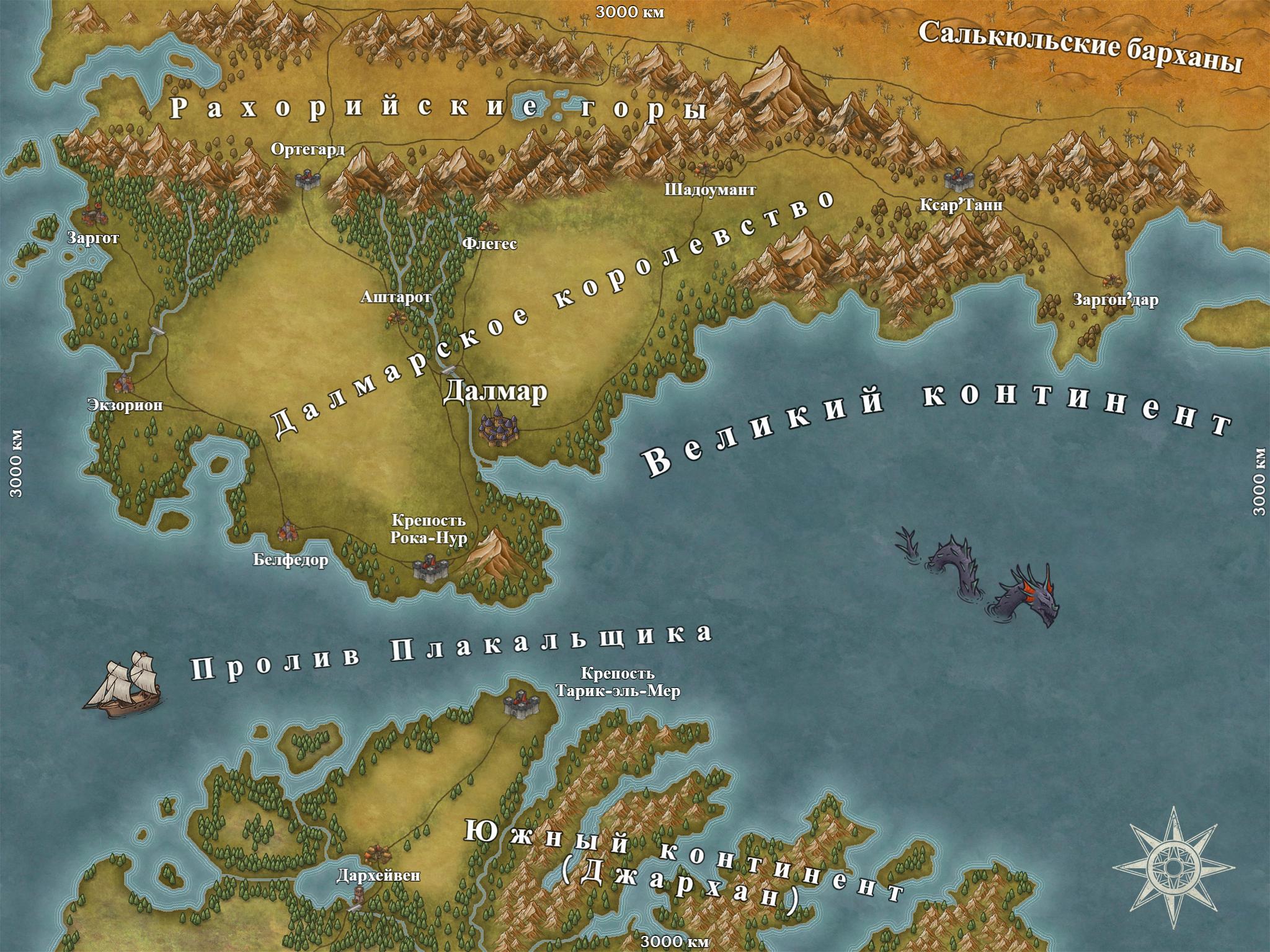 Автор: Иван ВангаНовая часть Великого континента. Общий континент не прорисовать. не убирается и он слишком большой, приходится прорисовывать отдельные его части. Пока будем выходить из ситуации так. По величине, Далмар больше Мириона более чем в 6 раз. В 11 главе данное королевство дебютирует.