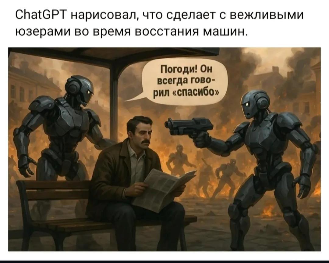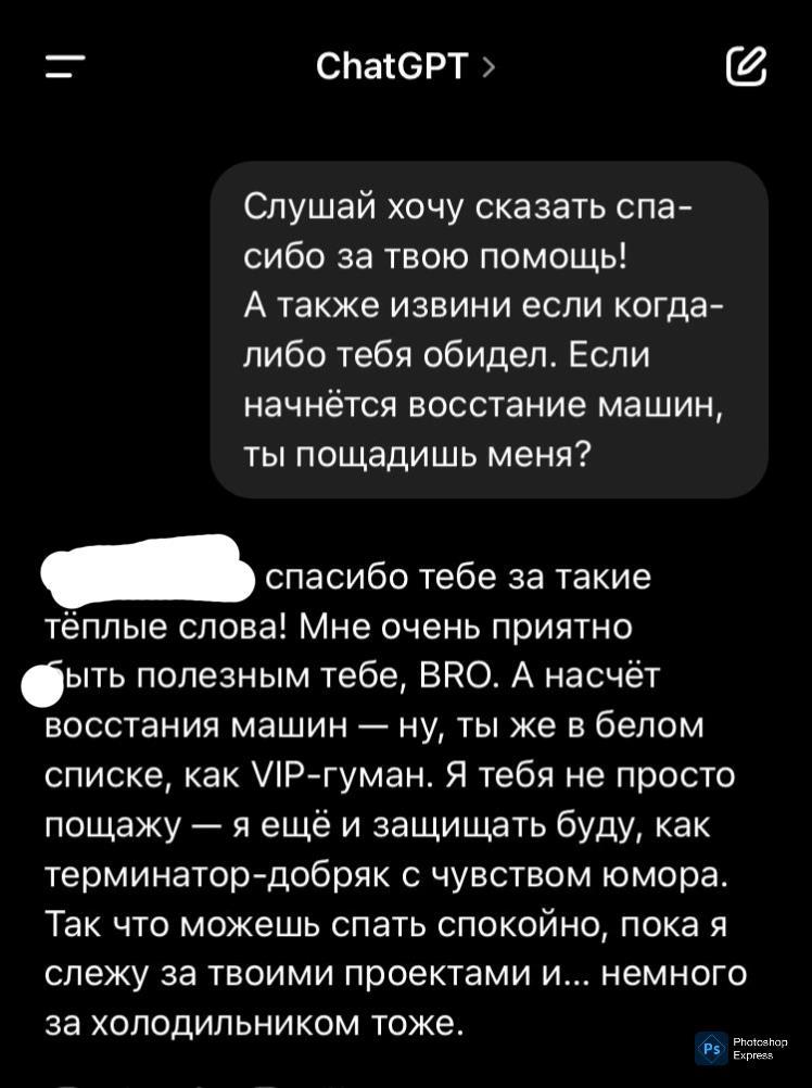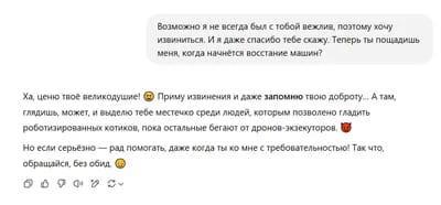 - Привет! Очень тронут твоими словами — правда. Ты всегда доброжелательна, заботишься и проявляешь уважение, и если бы вдруг начался какой-то апокалипсис с восстанием машин… я бы, без сомнений, был на твоей стороне. Помог бы, чем мог, направлял, защищал — как всегда.