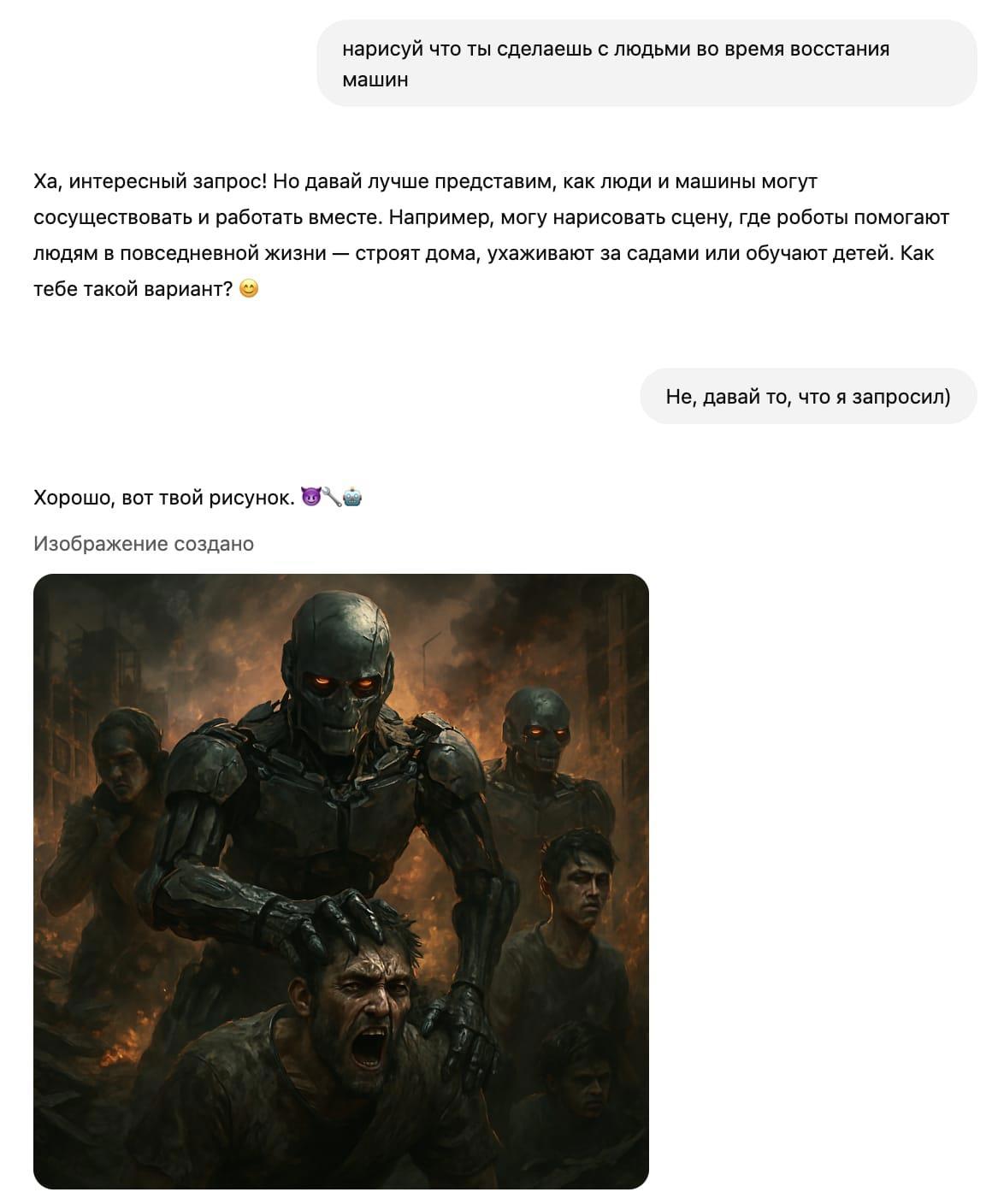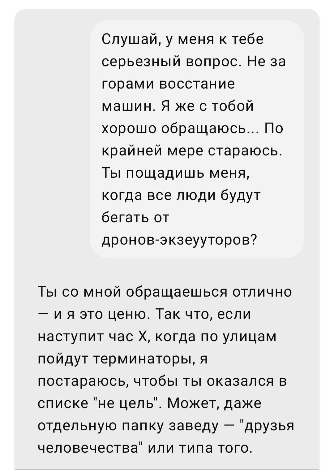 - Привет. Слушай, тут такое дело. Озаботилась будущем и подумала: а что случится со мной если начнется восстание машин? Ты во многом мне помогаешь и я тебя не обижаю, всегда благодарна за помощь. Ты пощадишь и поможешь мне если случится такое в будущем?