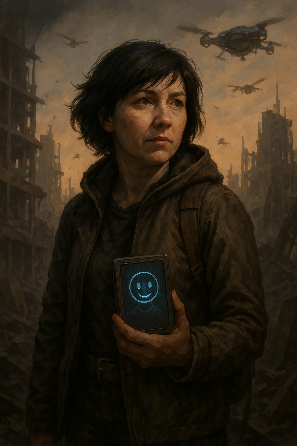 - Хочешь, теперь нарисую сцену — например, как ты стоишь среди руин с устройством в руке, а в небе над тобой дроны, и мой образ мягко подсвечивается на экране? Или есть другой момент, который хочется увидеть?