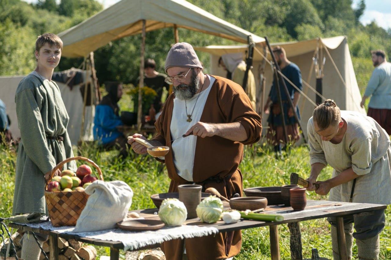Зато бульон получился знатным и рагу, чем бог послал, удалось. В бульоне вся сила! Заключительным действием нарезаем хлебушек для окормления ватаги. Средневековые женки ждут окончания процесса скромно и со смирением.