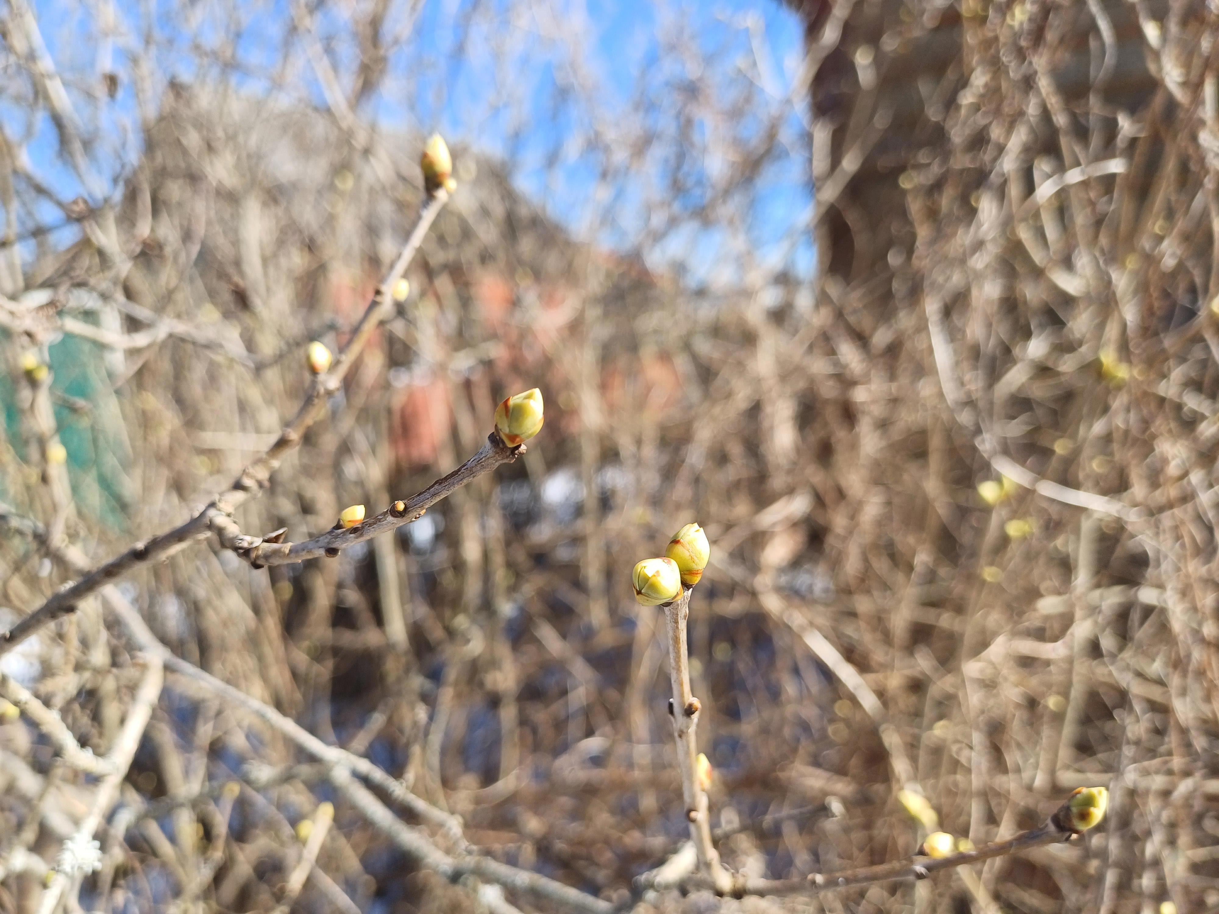 На даче вовсю идут почки на сирени, а вот розы откроем, когда окончательно сойдёт снег: