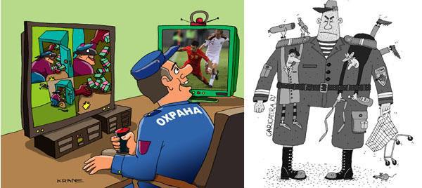 Помню случай, который мне поведал тот же Леверлин, как на одном серьезном "Ящике", начальник охраны увидел мирного местного сотрудника, который имел наглость, в обеденный перерыв, сидеть на траве не только без ботинок, но и вовсе босиком.Старший альгвазил дошел до применения громких и нехороших слов, вплоть до хватания за кобуру, причем толком так и не мог объяснить, в чем тут криминал. Кстати, когда этот же приятель, как то просто шел по Москве, из приоткрытых ворот, на него набежал человек в камуфляже с автоматом, но без знаков различия и потребовал предъявить документы. Я позднее успокоил друга, сказав, что это был пилотный выпуск очередной передачи "Розыгрыш" и что малограмотный цербер, перепутал его с молодым Хемингуэем. Не так давно лично наблюдал охранительный перфоманс и даже принял в нем некоторое участие... Проходя по тихой Московской улочке, увидел мирного на вид человека, который стоя на общественном тротуаре снимает на мобильник солидную чуть ли не литую вывеску исполненную в весьма оригинальном дизайне. И тут из дверей выскакивает здоровенный охранник и почему то тонким дискантом, требует не только прекратить съемку, но и засветить пленку. У бедного папарацци был настолько испуганный вид, а у охранителя настолько идиотский, что я решил вмешаться и заодно и развлечься. Я солидно спросил караульного, а можно ли просто смотреть на вывеску, на что он задумавшись на минуту другую, утвердительно кивнул головой, на что я заявил, что данный прохожий просто плохо видит и посему пользуется мобильником как очками, а посему пленка в его аппарате отсутствует, после чего попросил его подтвердить отсутствие наличия пленки в его девайсе. А фотографу сказал строгим тоном стражника из Шварцевского "Дракона" - "Еще раз подобное повториться, отправим к окулисту". Учитывая что оба участника сценки оцепенели, шутка явно удалась.