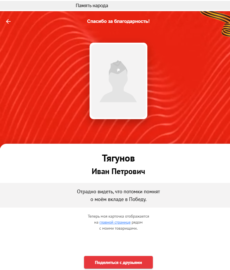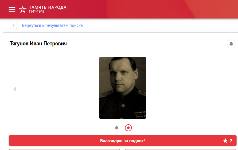 P.S. При подготовке материала, набрёл на вариант сайта «Память народа» с необычным оформлением: появилась надпись «Благодарю за подвиг», при нажатии которой появляется изображение со словами «Спасибо за благодарность» и цифра, с количеством поблагодаривших. Не знаю сколько человек воспользуется этой информацией, но за вчерашний день я эту кнопку нажимал не раз.