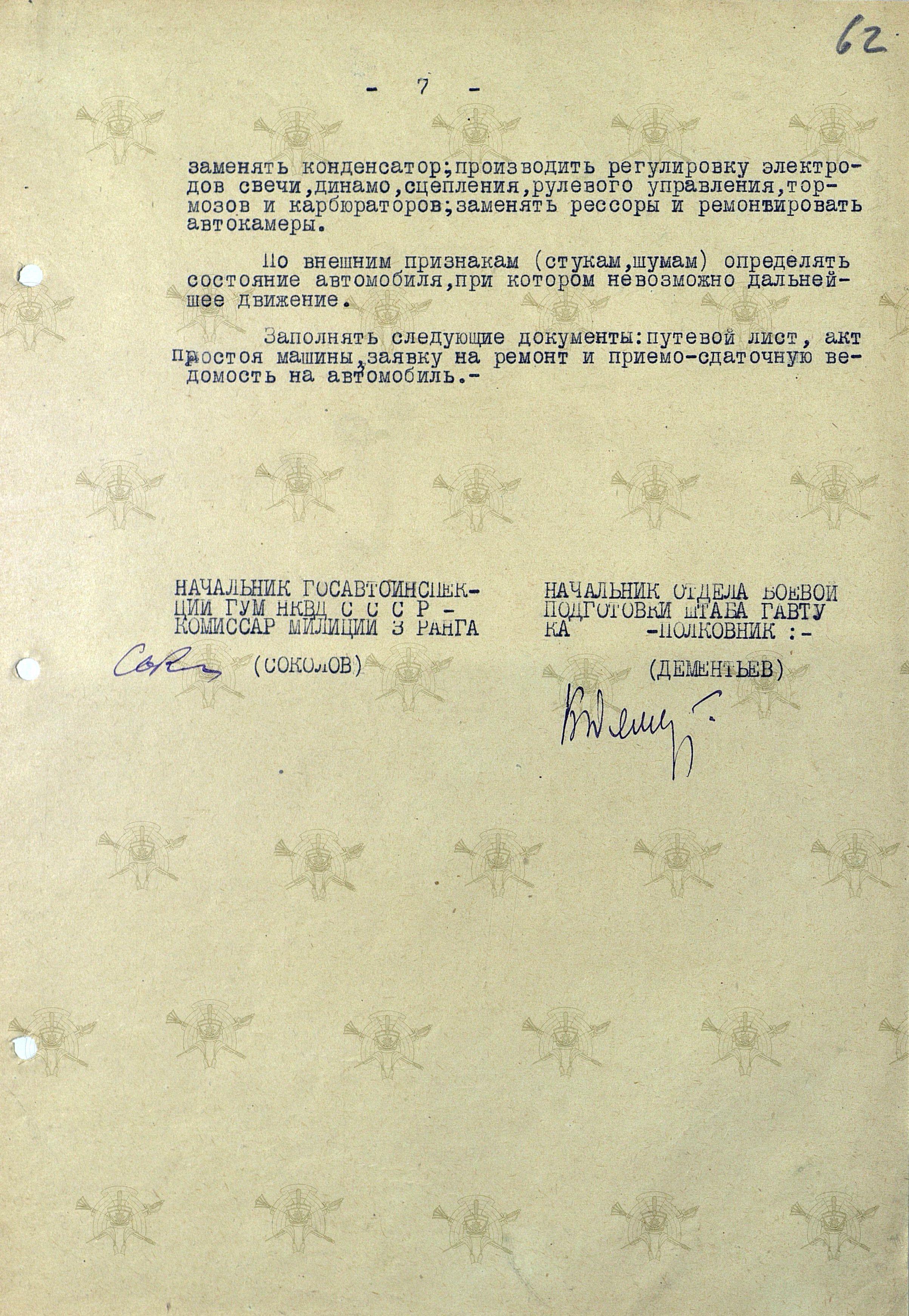 Положение подписано начальником государственной автомобильной инспекции Главного Управления РКМ НКВД СССР комиссаром милиции 3 ранга Николаем Васильевичем Соколовым, фотографию которого, к сожалению, не нашёл и начальником отдела боевой подготовки штаба ГАвтУ полковником Дементьевым Константином Ивановичем.
