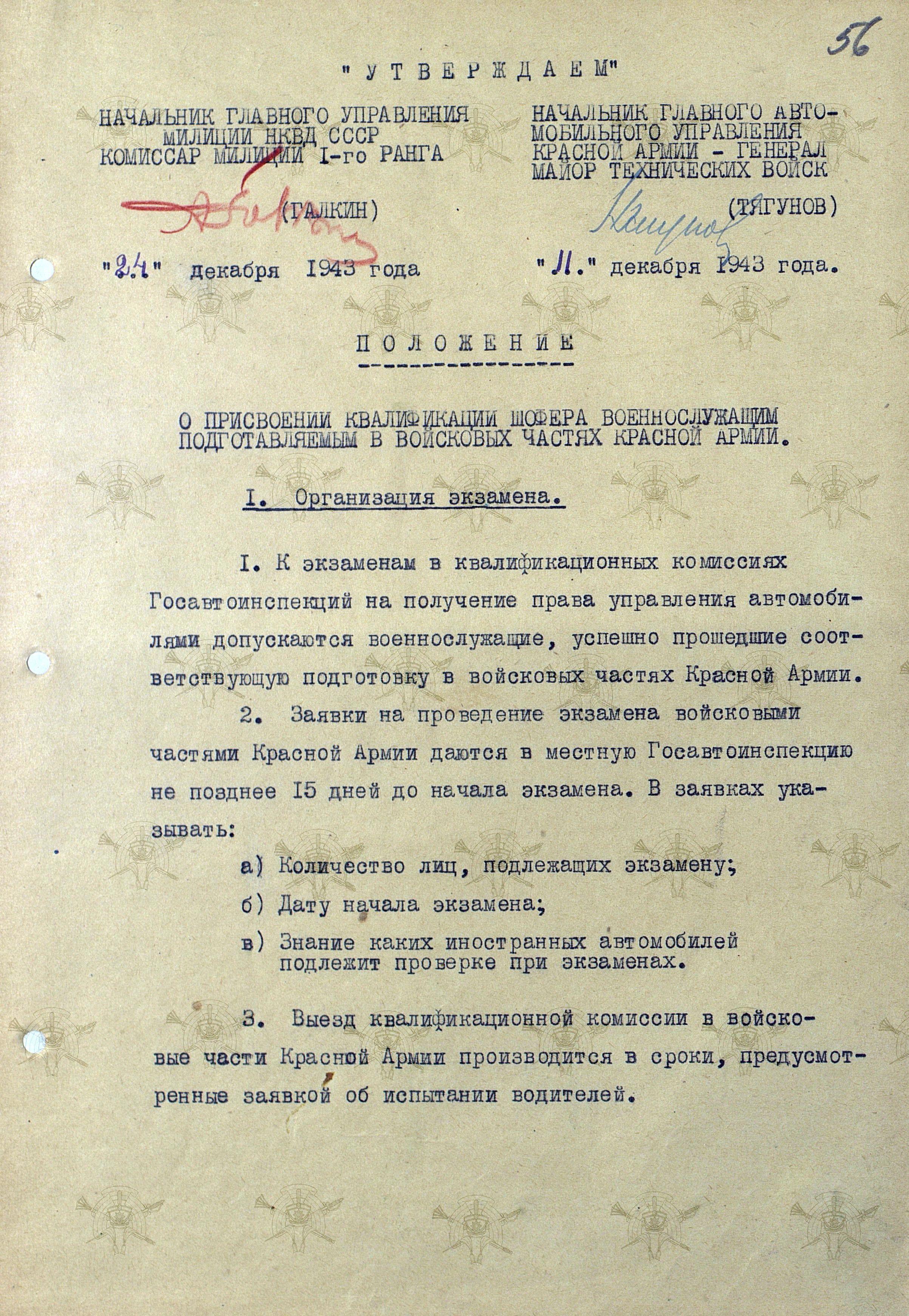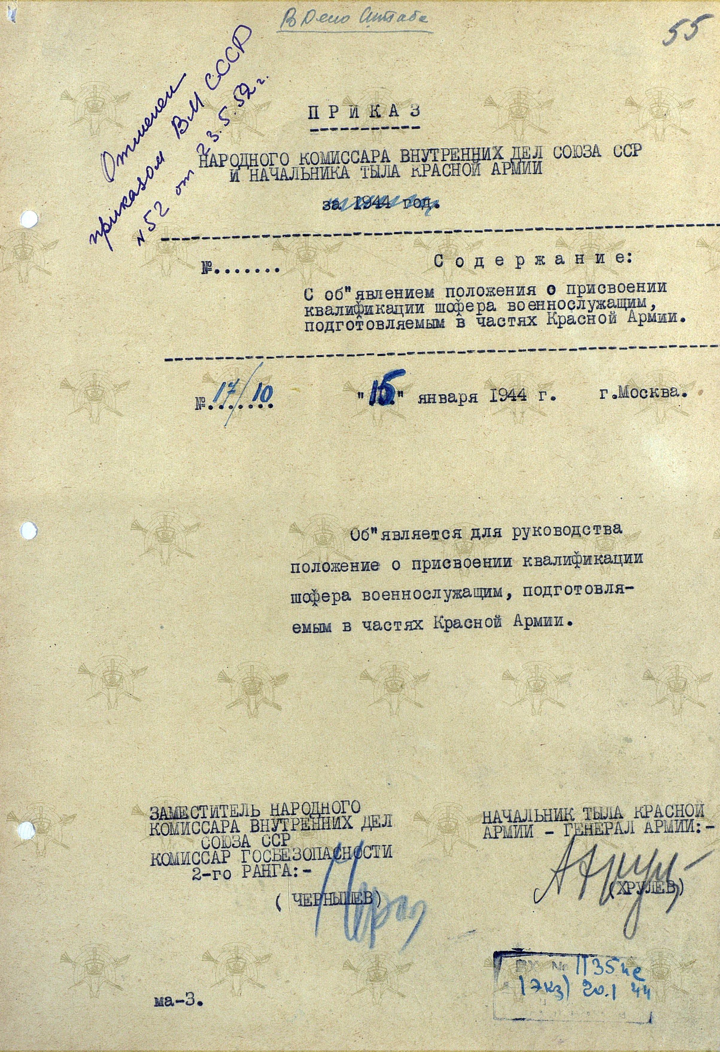 А чтобы ответить на этот вопрос, предлагаю внимательно прочесть совместный приказ Народного комиссара внутренних дел СССР и начальника Тыла Красной Армии от 15 января 1944 г. № 17/10 «Положение о присвоении квалификации шофера военнослужащим, подготовляемым в Красной Армии». Думаю, причина, по которой приказ подписан замом Наркома внутренних дел СССР вполне понятна — милиция, и в частности — ГАИ, входили в состав НКВД.