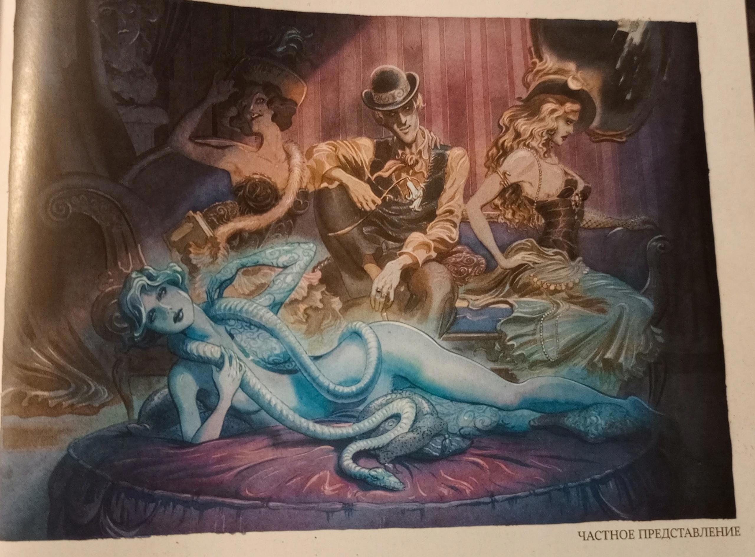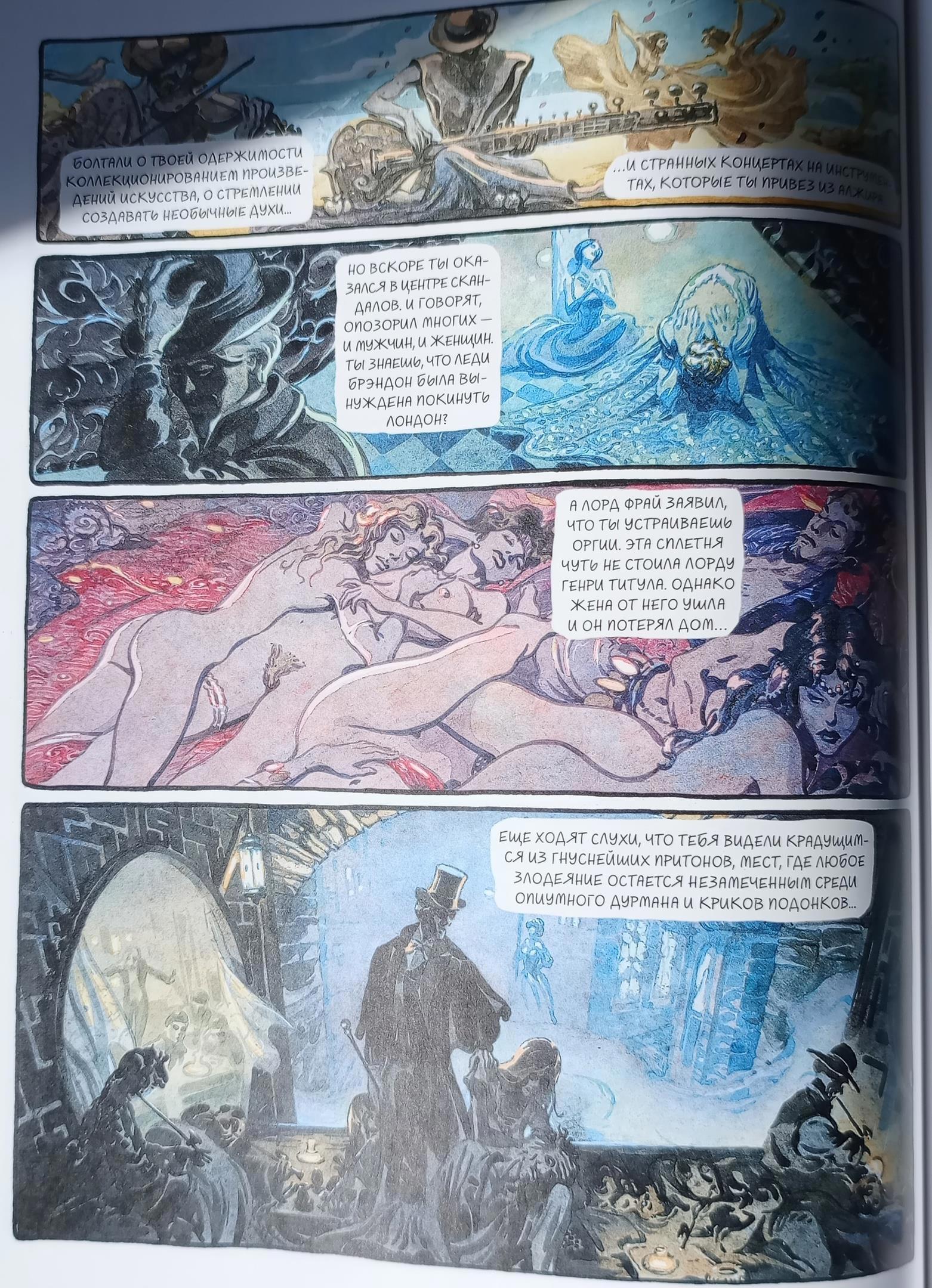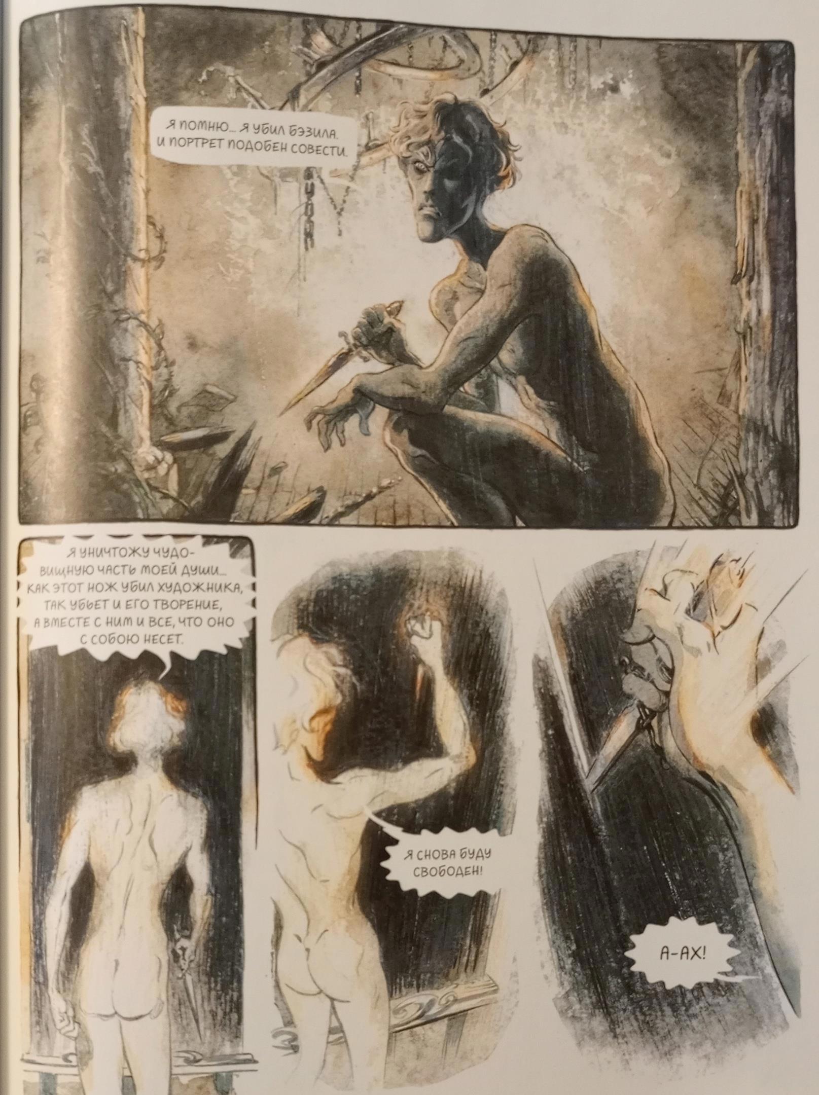 Теперь хочу поговорить об изданиях этого романа. Я приобрела издание с иллюстрациями. Именно их я вставляла выше. А ещё я купила комикс по мотивам романа. Именно что по мотивам. Его нарисовал французский художник и решил немного осовременить роман. И это яркий пример того, как писать не надо! И пример того, как можно испортить великолепный роман. Художник решил обнажёнки добавить, и это просто крах. Сибил, танцующая голой перед мужиками на сцене театра, - это-то в викторианской Англии? Там даже слово "любовница" ("mistress") цензура изъяла из романа, не то что кто-то бы в Лондоне устраивал эротическое шоу на сцене театра. И я ни разу не поверю, что стриптизёрша бы покончила с собой из-за мимолётного романа, пусть и с представителем высшего света. А в финале Дориан вообще после наркотусовки у Гарри вдруг обнаруживает себя голым возле своего портрета... Но картинки да, в комиксе интересные. Хоть книга имеет рейтинг 16+, картинки я всё равно спрячу под спойлер 18+.