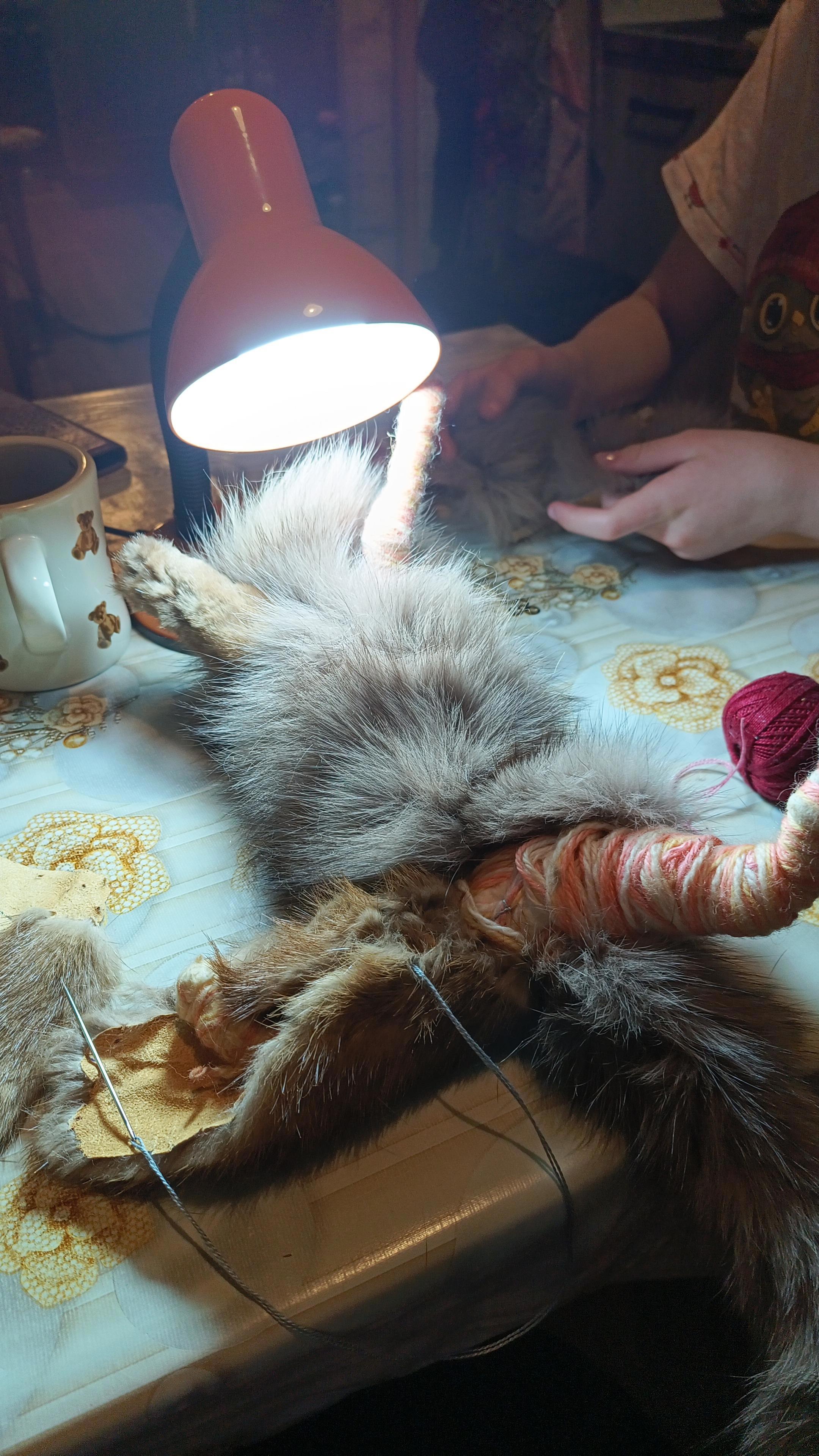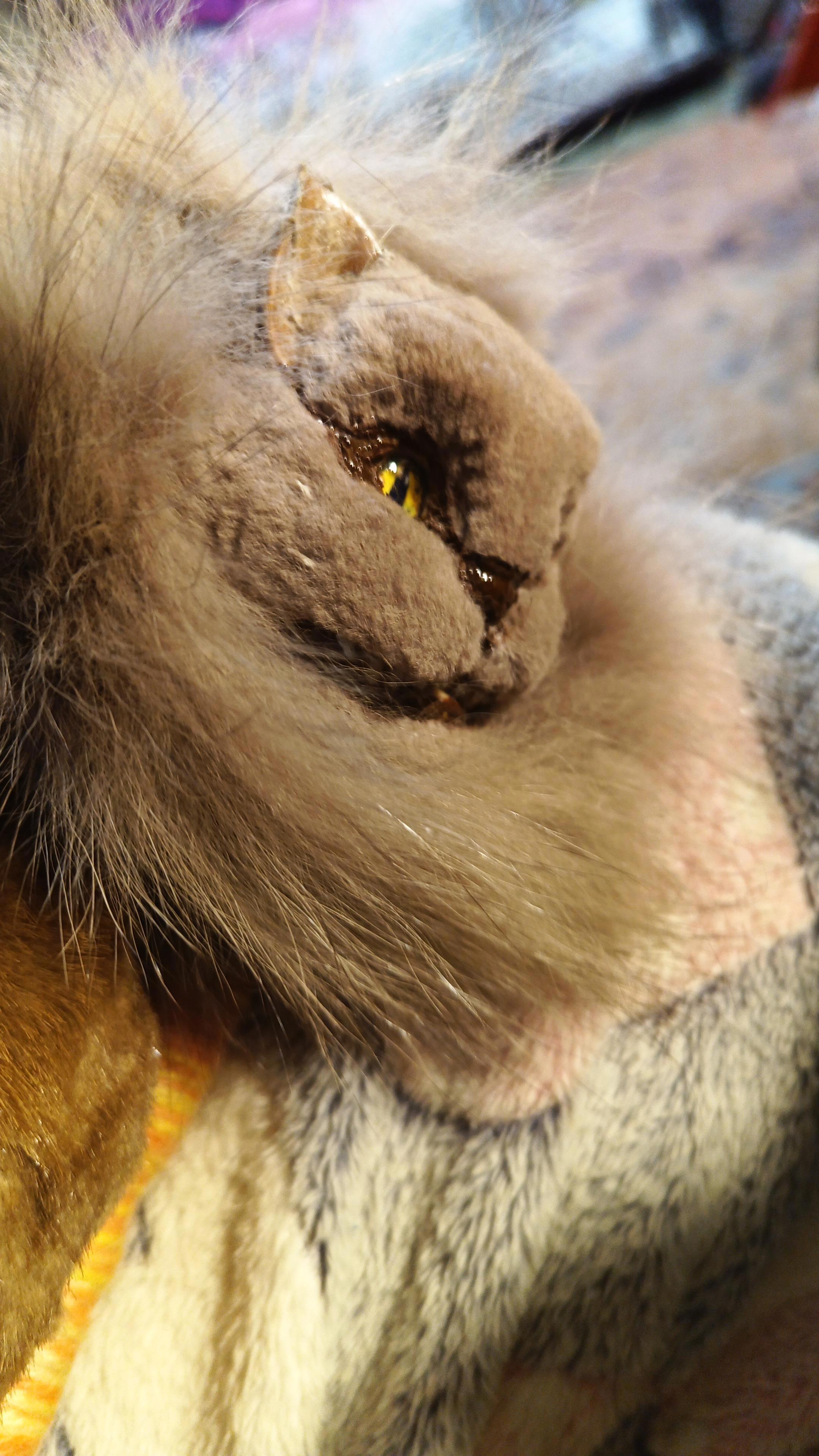 Сегодня случайно наткнулась на освежеванного кота, что прятался в сумке с обрезками меха. Несчастный был извлечён и частично обшит шкурой, точнее воротником от старого пуховика. Каждая дичь имеет право быть сотвореной. Вот такой тактильный меховой бандит получается