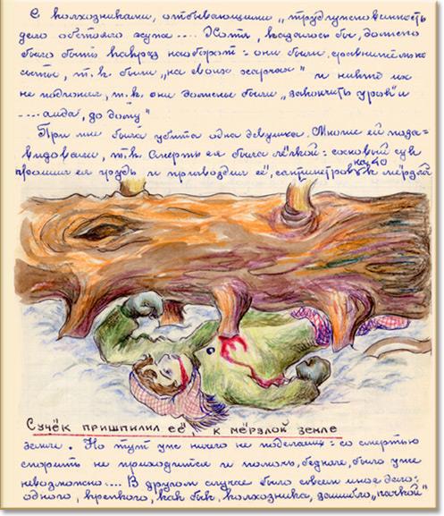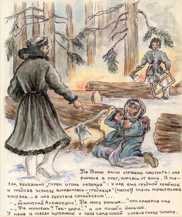 «На Валю было страшно смотреть. Она рухнула в снег, корчась от боли. У нее был грудной ребенок, и воспалилась железа, начался мастит. Это очень мучительная болезнь. Валя работала сучкорубом. – Дмитрий Васильевич, не могу больше! - прохрипела она. Не можешь, так умри, - и он пошел дальше».