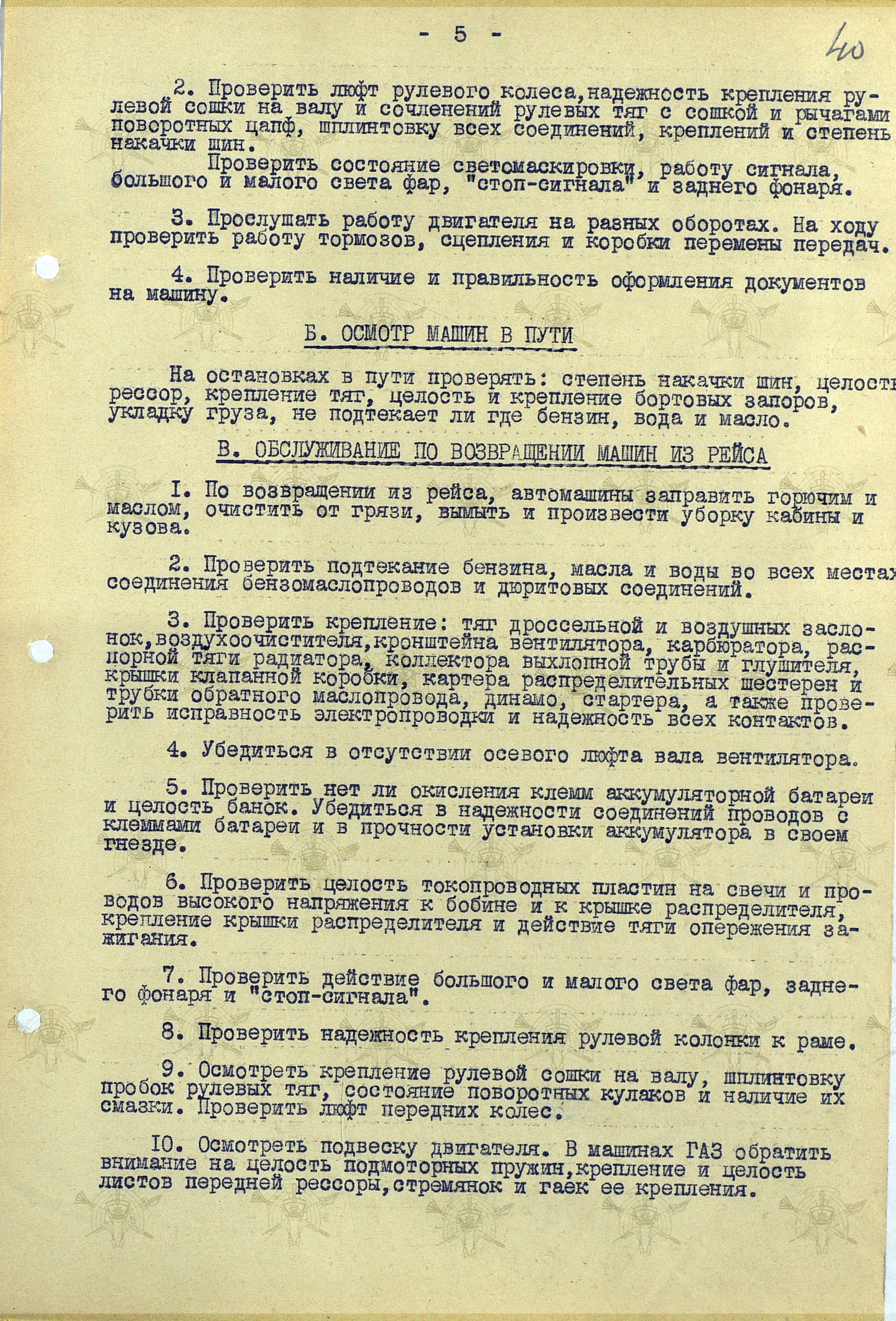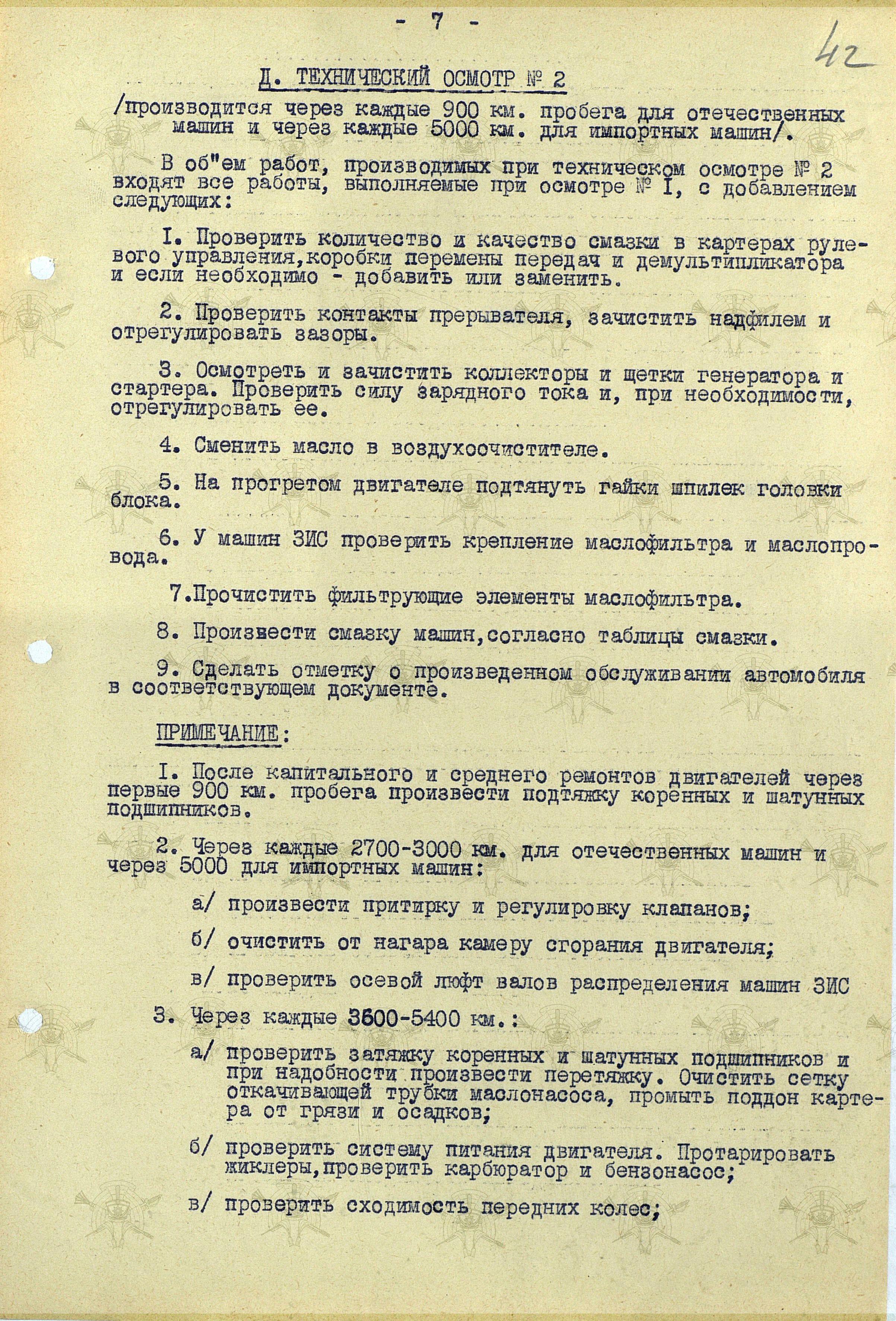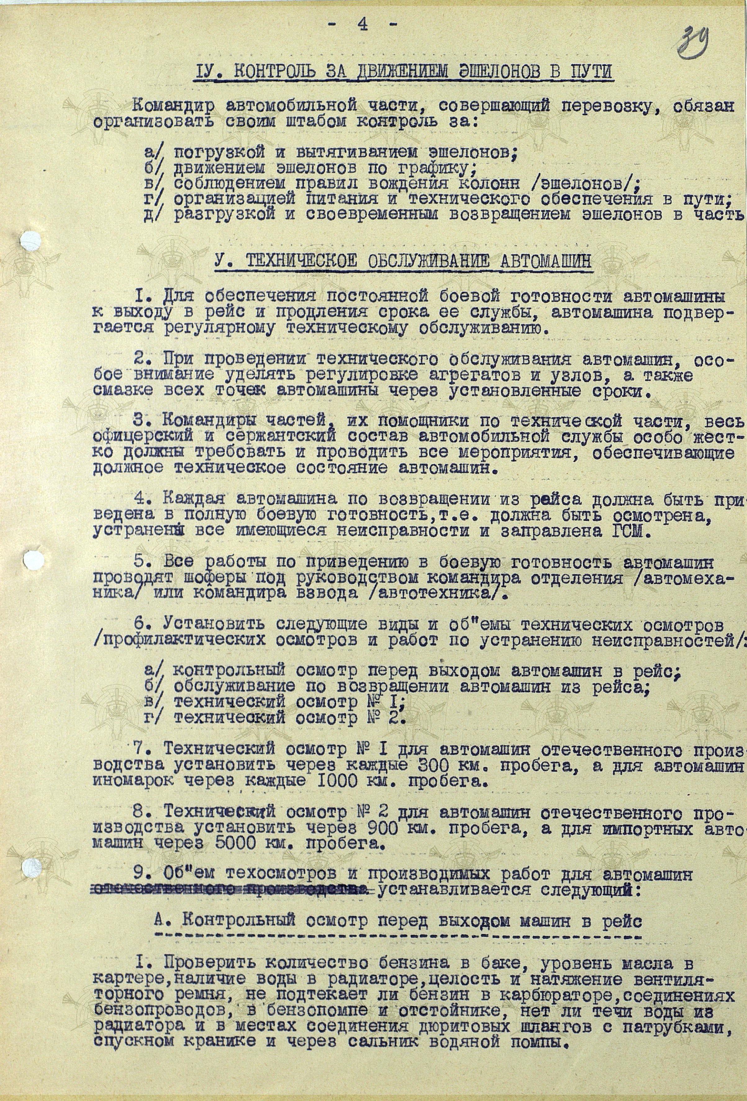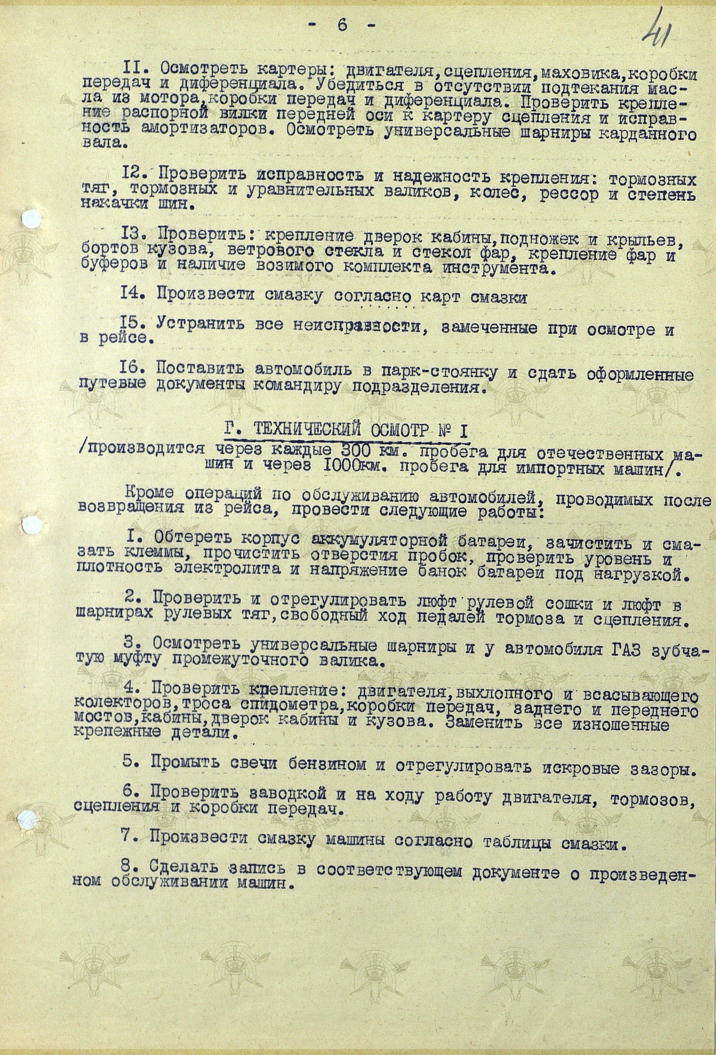 Но, для военного шофёра, более полезен другой документ — сама Инструкция, являвшаяся приложением к приказу. Конечно, некоторые разделы документы водителям не интересны, ведь они касаются не него, а вышестоящего командования. Например, раздел II. «Планирование использования, обслуживания и ремонта автомашин» или IV. «Контроль за движением эшелонов в пути». А вот весь раздел «Техническое обслуживание автомашин» шоферов касается напрямую.