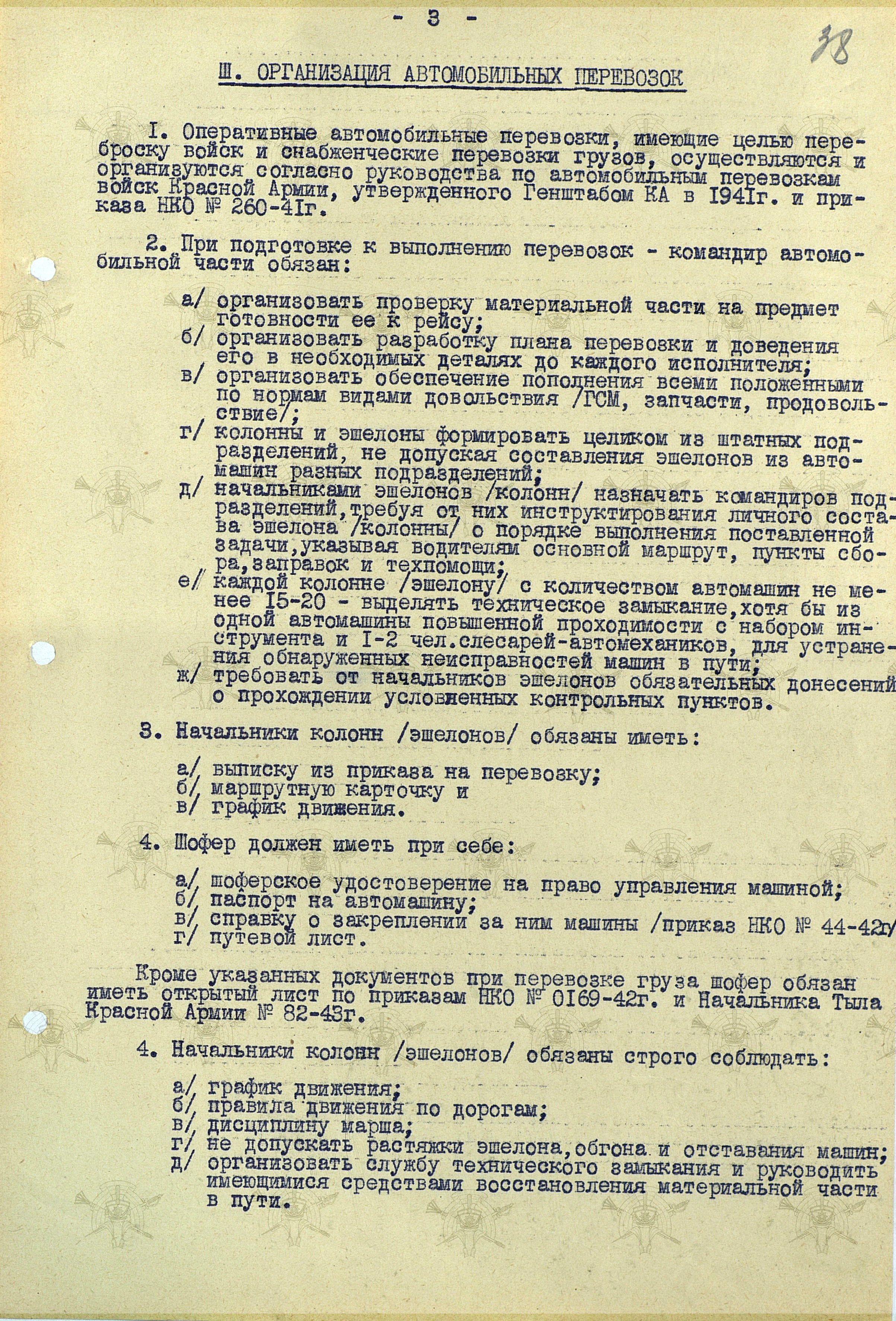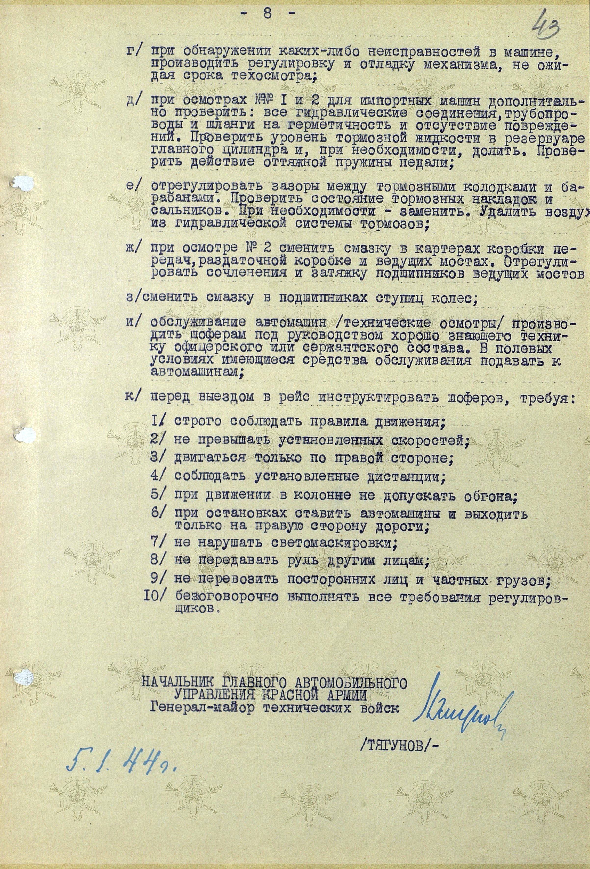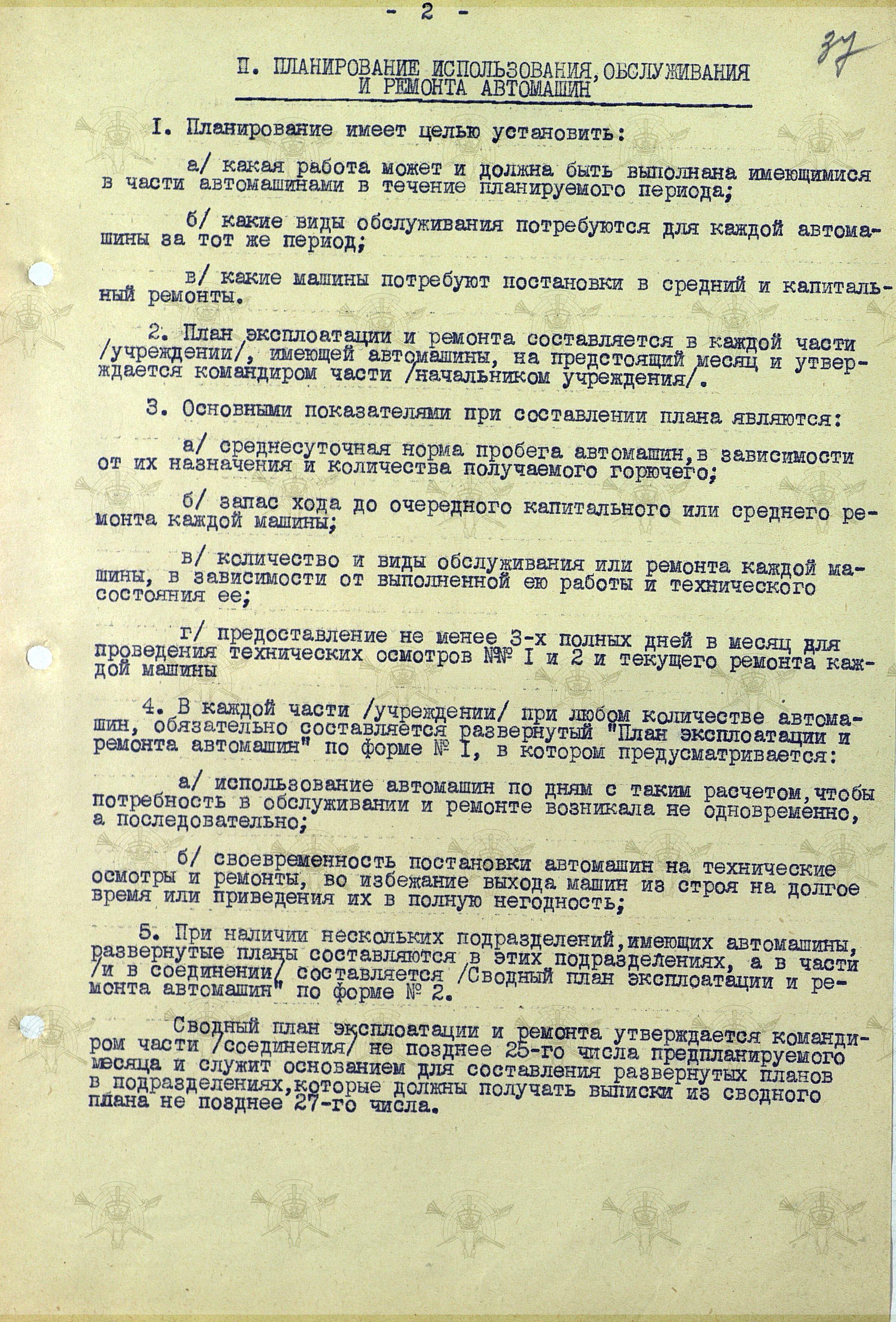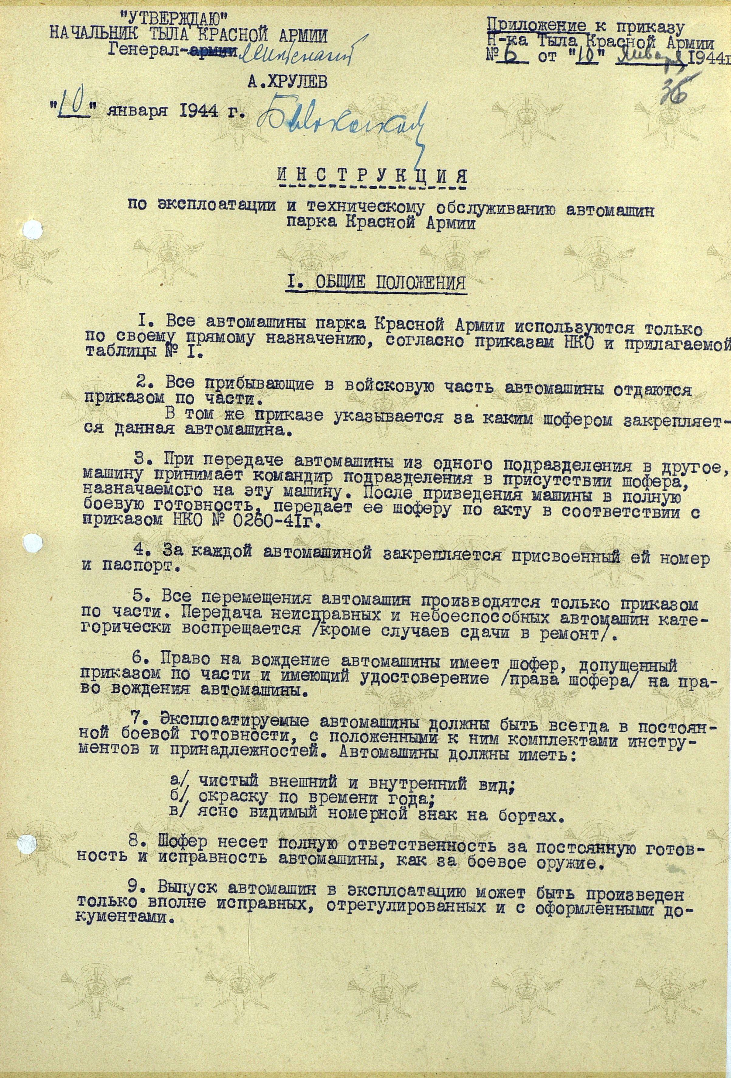 Но, для военного шофёра, более полезен другой документ — сама Инструкция, являвшаяся приложением к приказу. Конечно, некоторые разделы документы водителям не интересны, ведь они касаются не него, а вышестоящего командования. Например, раздел II. «Планирование использования, обслуживания и ремонта автомашин» или IV. «Контроль за движением эшелонов в пути». А вот весь раздел «Техническое обслуживание автомашин» шоферов касается напрямую.