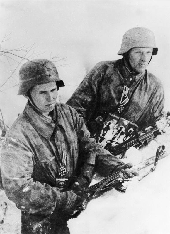 Немецкие солдаты — отец и сын, награжденные Железными крестами, на позиции на окраине Бреслау (ныне Вроцлав, Польша). Вероятно, они из полка «Вель», сформированного из наземного персонала люфтваффе. Вооружены штурмовыми винтовками Sturmgewehr 44.