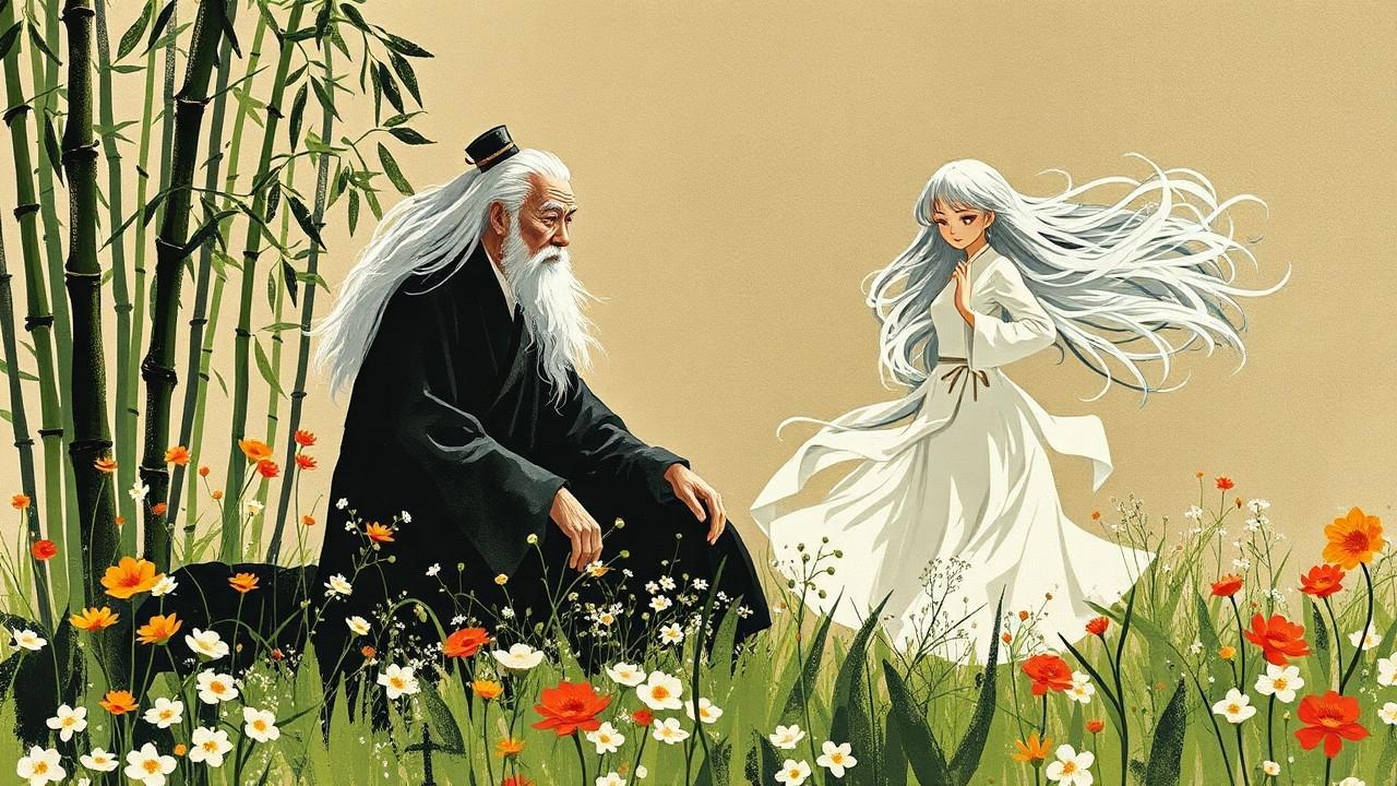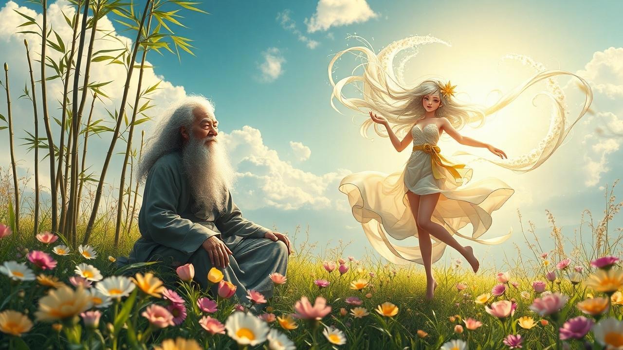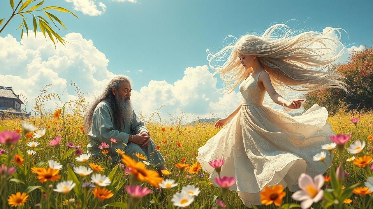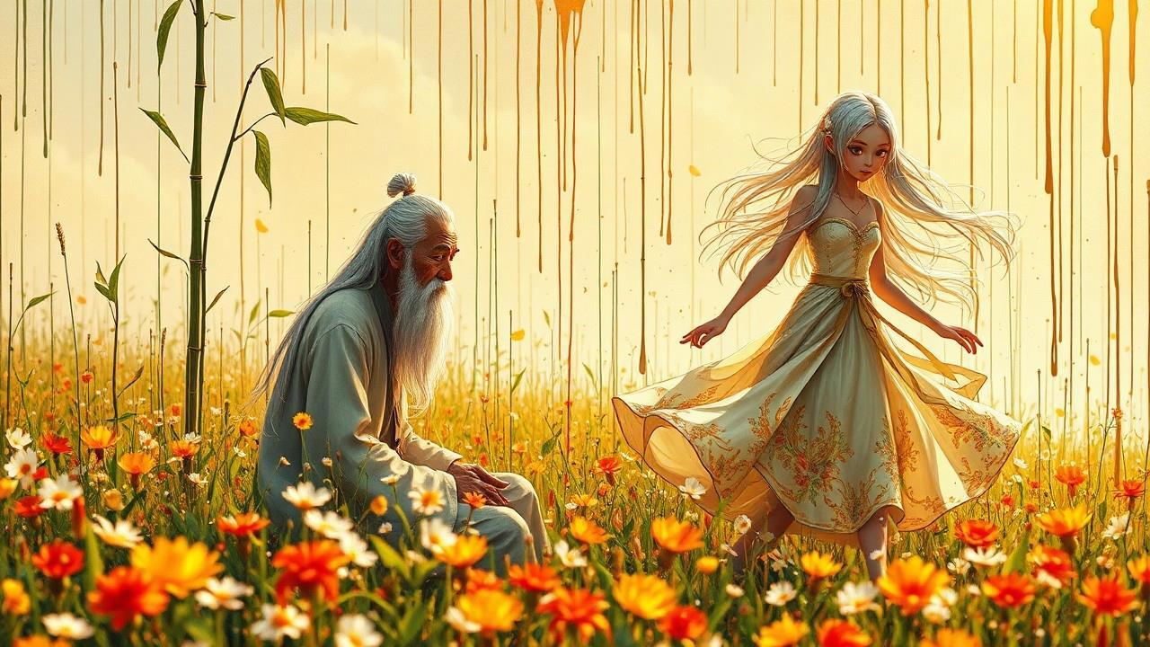 Автор: Nikela (Эбигейл Вотс)На солнечной поляне, где цветы распускались в ярких и насыщенных красках, а свежий ветер приносил с собой ароматы зелени и терпкого чая, сидел старец. Его окружали стебли бамбука, создавая атмосферу уединения и покоя. Длинные седые волосы старца развевались на ветру, словно облака, а его глаза, полные мудрости, искрились, как звезды на ночном небе.
