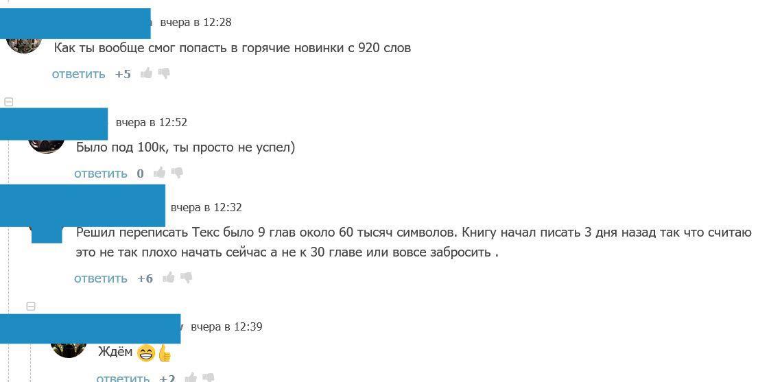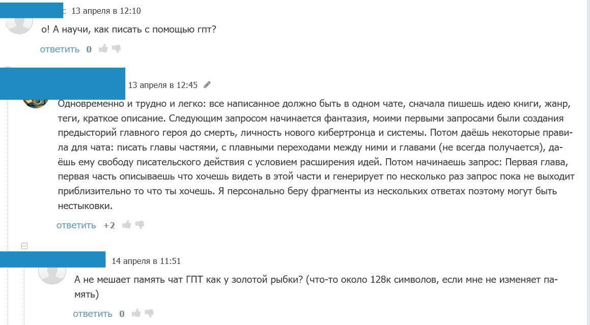 Чувак наваял свои фантазии в скелет сюжета и при помощи нейросетки забацал буквосодержащий продукт. За пару-тройку дней поднял 200 с лишним лайков, побывал в горячих новинках и отхватил дозу потребителей-читателей. Про количество знаков, вообще, молчу. В комментах говорят, что сначала 100.000 было. Потом..да хрен его знает, что потом.