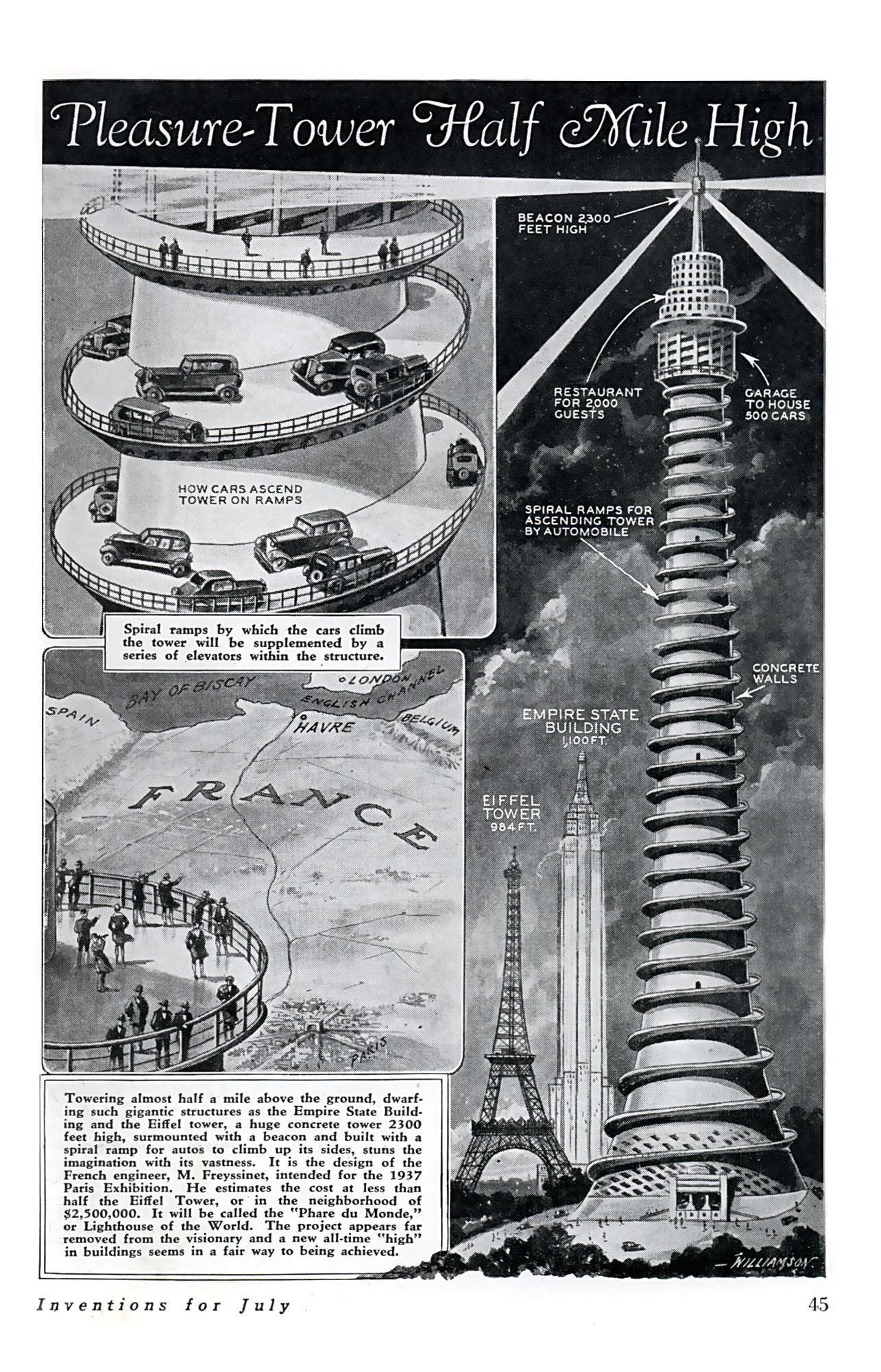 Башня на смену Эйфелевой, чтобы сразу всю Францию посмотреть. Тоже без лифта с пандусом для автомобилей. Я так понимаю, спускаться они должны по внутренней спиральной дороге, проходящей в стволе сооружения. Как по мне - неудобно - стоянки нет.