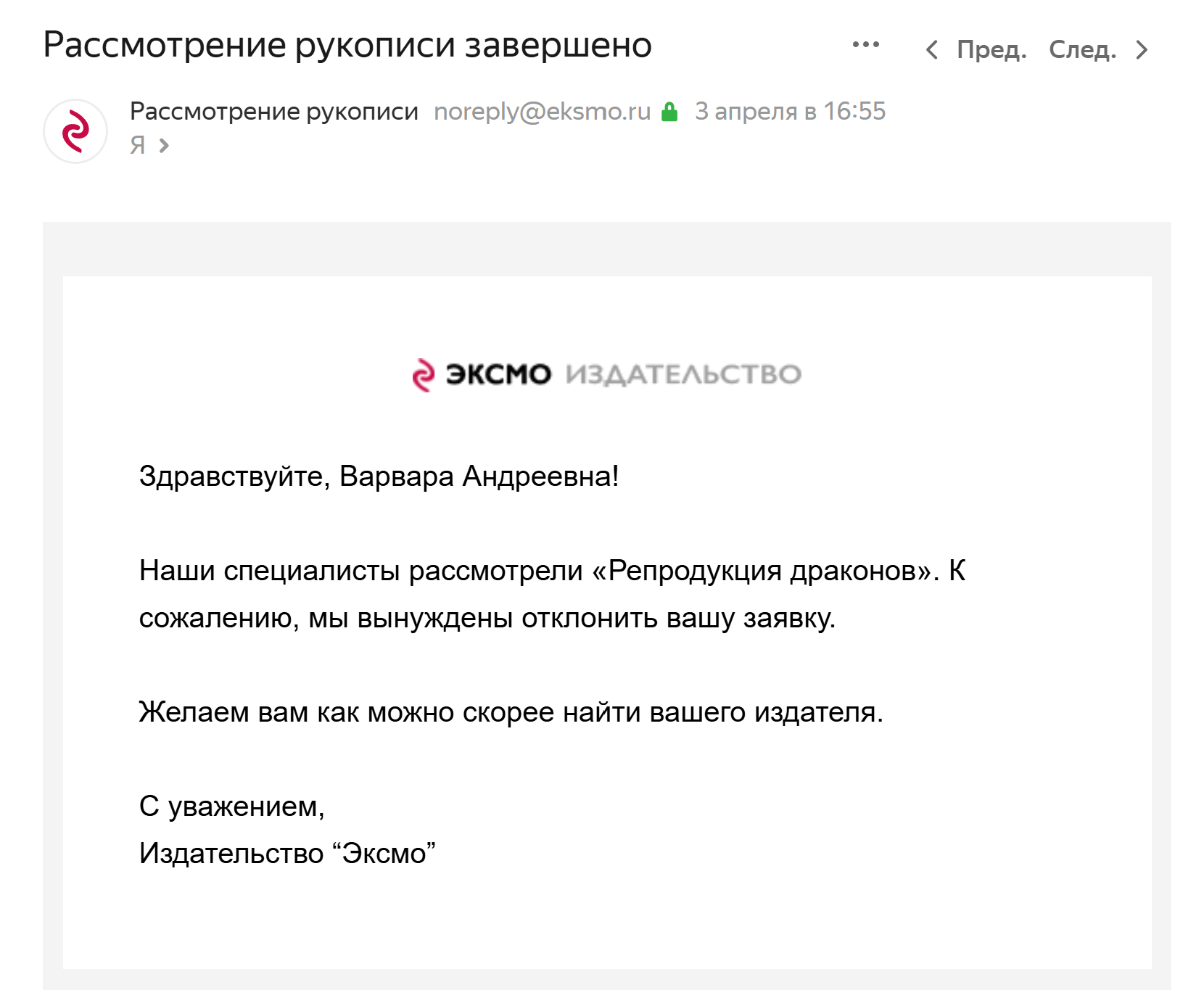 Каюсь: я отправила туда свою рукопись. НО! Это было сделано в дни отчаяния, после того, как я получила отказ от издательства "Кислород" (импринт РОСМЭН, информацию смотри по ССЫЛКЕ). Отказ от Эксмо приходит на почту и выглядит так: