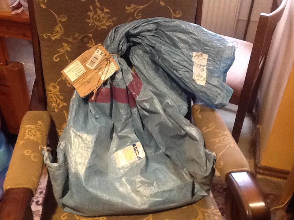 Приехал листонош и вручил мне синий мешок. Я от изумления даже не стала такое распечатывать — нетронутое принесла домой и сфотографировала весь процесс. Мне впервые принесли подарки в мешке!