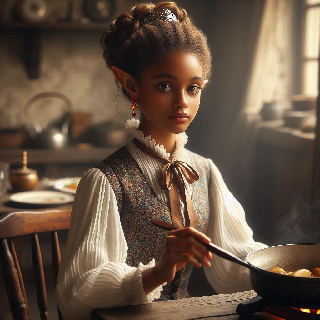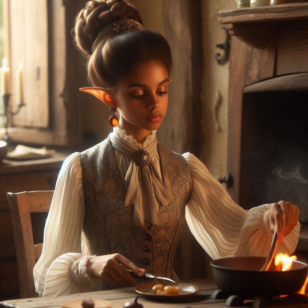 A 14-year-old elf girl with an elegant, pinned-up hairstyle secured with a small metallic ornament sits at a rustic wooden table, cooking a meal in a pan over an open flame in a cozy 19th-century kitchen. She wears a fine batiste blouse under a patterned silk vest, with a ribbon tie fastened by a brooch. Amber earrings and soft daylight highlight her delicate face. The room is warm, detailed, and photorealistic, in a subtle fantasy style.