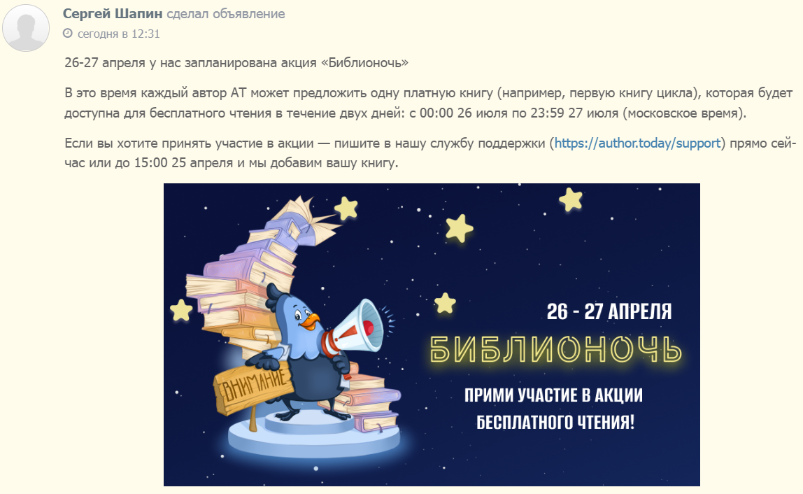 Автор: Михаил ЭмНа 26-27 апреля на АТ объявлена акция «Библионочь».