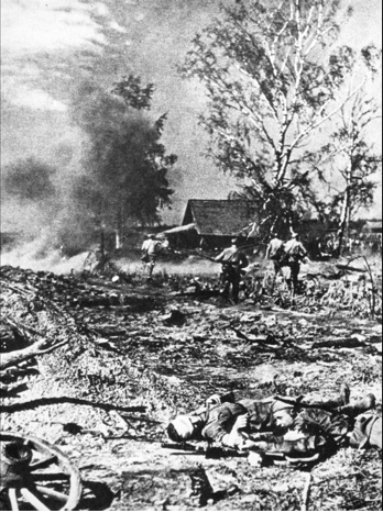 "Вся поляна, примерно в восемь гектаров, сколько хватало взора, сплошь была устлана трупами наших солдат. Одетые во все новенькое, они валялись в беспорядке, даже один на другом в разных позах. Молоденькие". А на краю поляны - MG-34, "и кругом горы гильз, пустых коробок и два скрюченных трупа пулеметчиков. Видно было, как они еле успевали отгребать от треноги гильзы, те высоким валом окружали их, даже со стороны ног". Смирнов А.Н. Это было под Ржевом // Это было на Ржевско-Вяземском плацдарме.