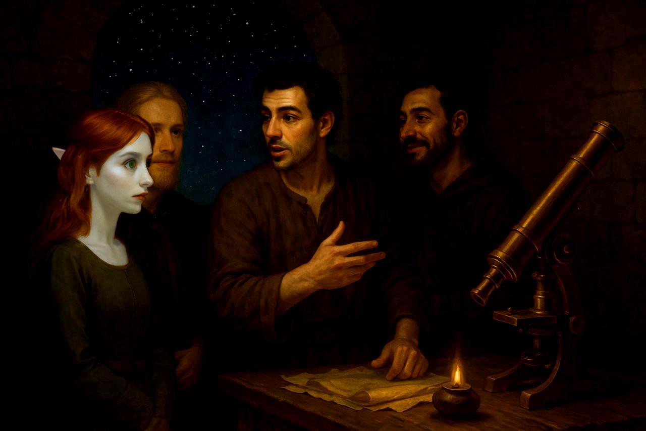 Итак, сцена из "Знака колеса". Мавретания, Ликсус, обсерватория в Булгарской башне. Слева направо: Танька, Олаф, Иосиф, Уфрин.
