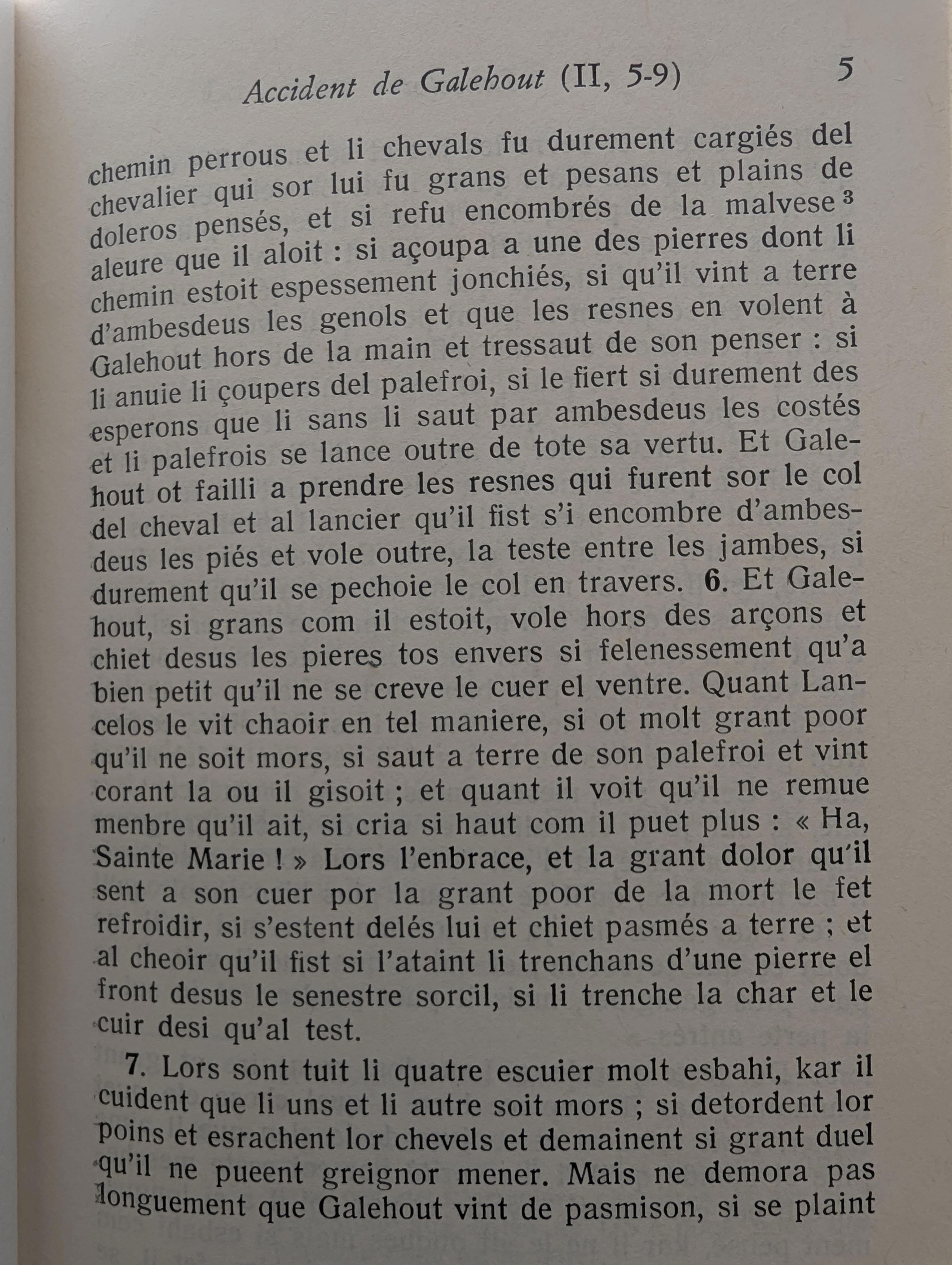 Увидев его падение, Ланселот страшно испугался, думая, что он убился при падении. Он соскочил со своей лошади и бегом бросился к упавшему. Видя, что тот не шевелится, Ланселот громко воскликнул - "О, Святая Мария!". Он сжал бесчувственного Галеота в объятиях, и страх за его жизнь до такой степени оледенил его сердце, что Ланселот лишился чувств, и, упав головой на камень, рассадил себе лоб и левую бровь едва ли не до кости.