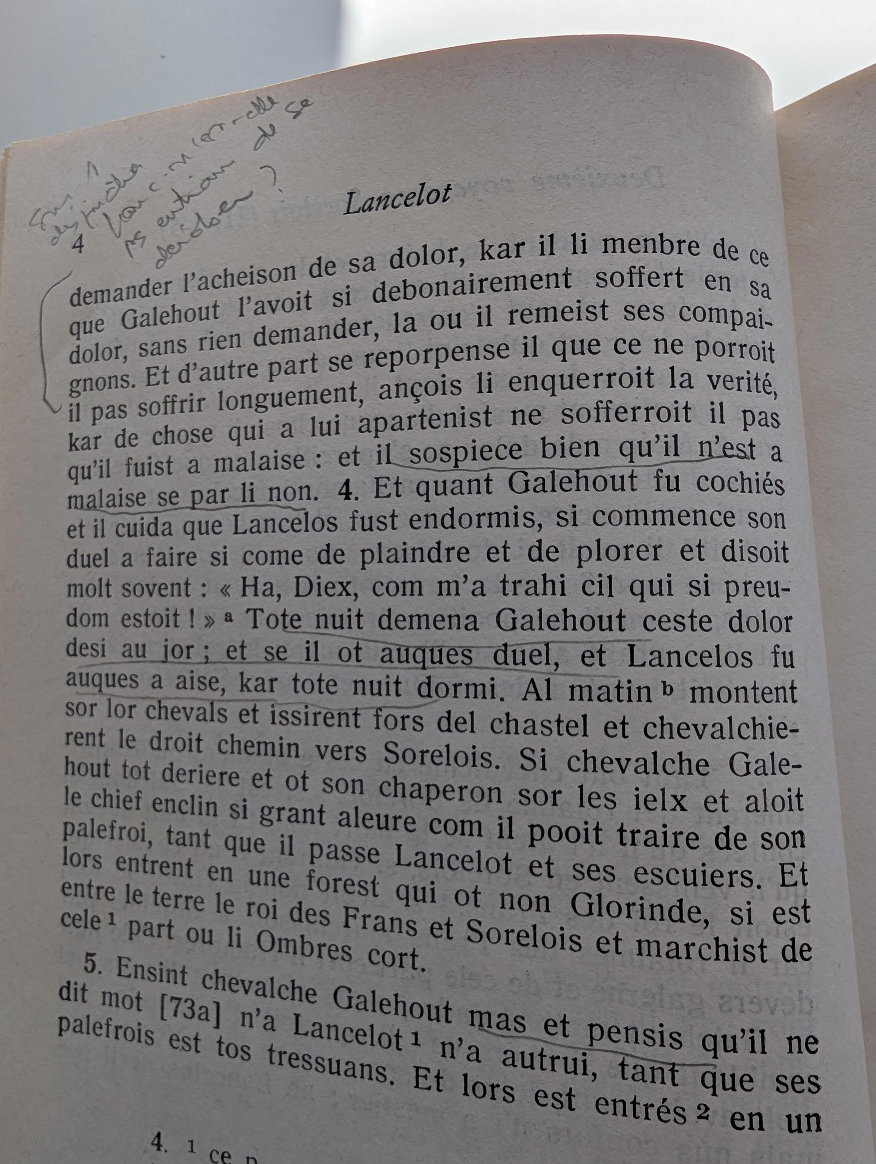 "Галеот ехал рядом со своим спутником [Ланселотом], одновременно радостный и опечаленный: радостный, потому что Ланселот ехал рядом с ним, и опечаленный, потому что он [Ланселот] возвращался в свиту короля Артура, ибо из-за этого Галеот думал, что потерял его навсегда. Он отдал ему [Ланселоту] свое сердце больше, чем может один человек/мужчина отдать сердце другому человеку/мужчине в качестве его товарища. И для доказательства этого не нужно иметь свидетеля, потому что в конце концов та боль, которую он испытывал от этого, отняла у него всю радость жизни, и он умер от этого, как дальше повествует эта история.