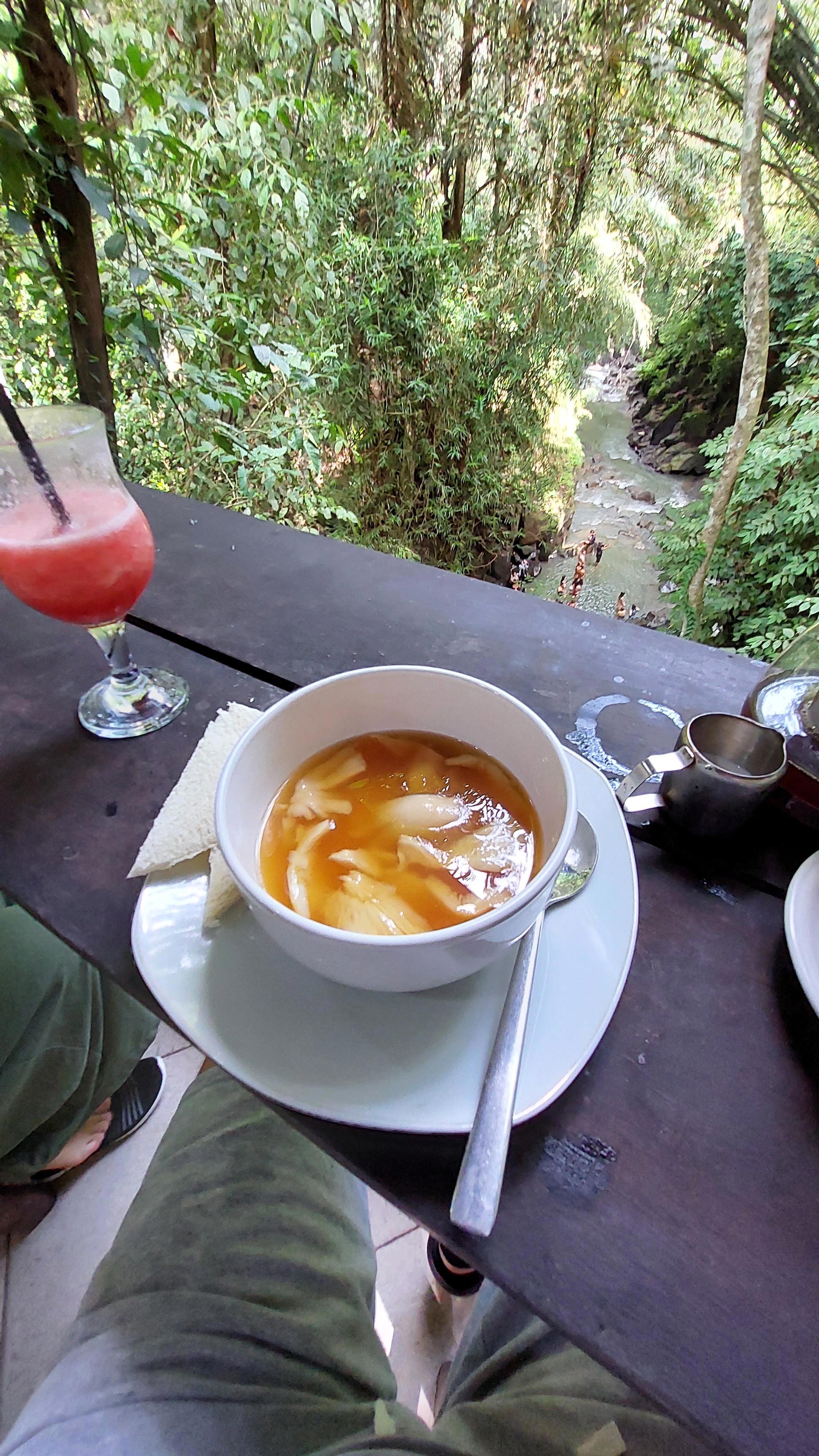 Заказали покушать. При разных вариантах выбора, я всегда предпочитаю жидкую еду. И в этот раз выбрал национальный грибной суп. Суп был, но вот в нём кроме бульона, было несколько кусочков грибов типа вешенки, крошенный чеснок и всё.