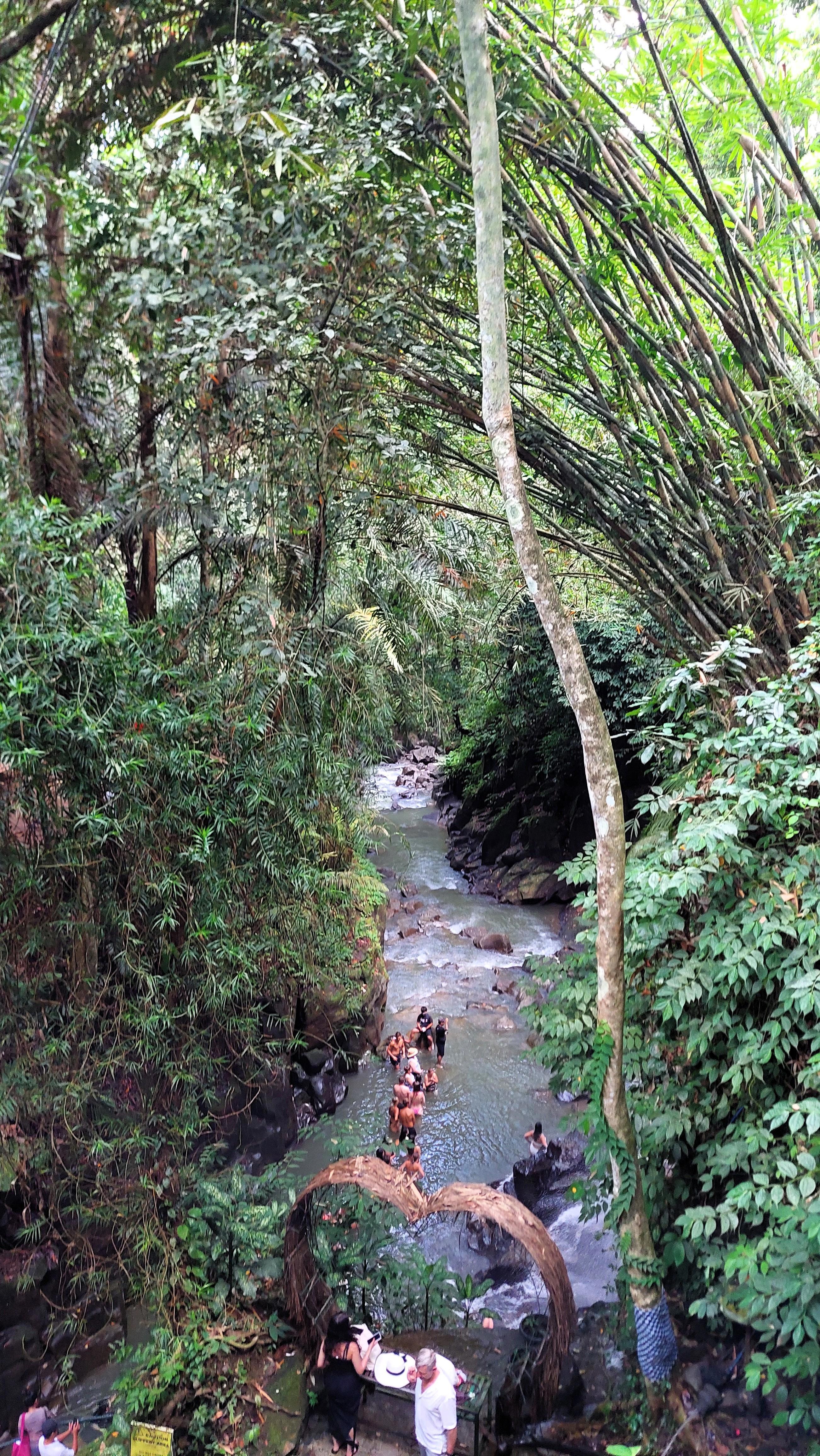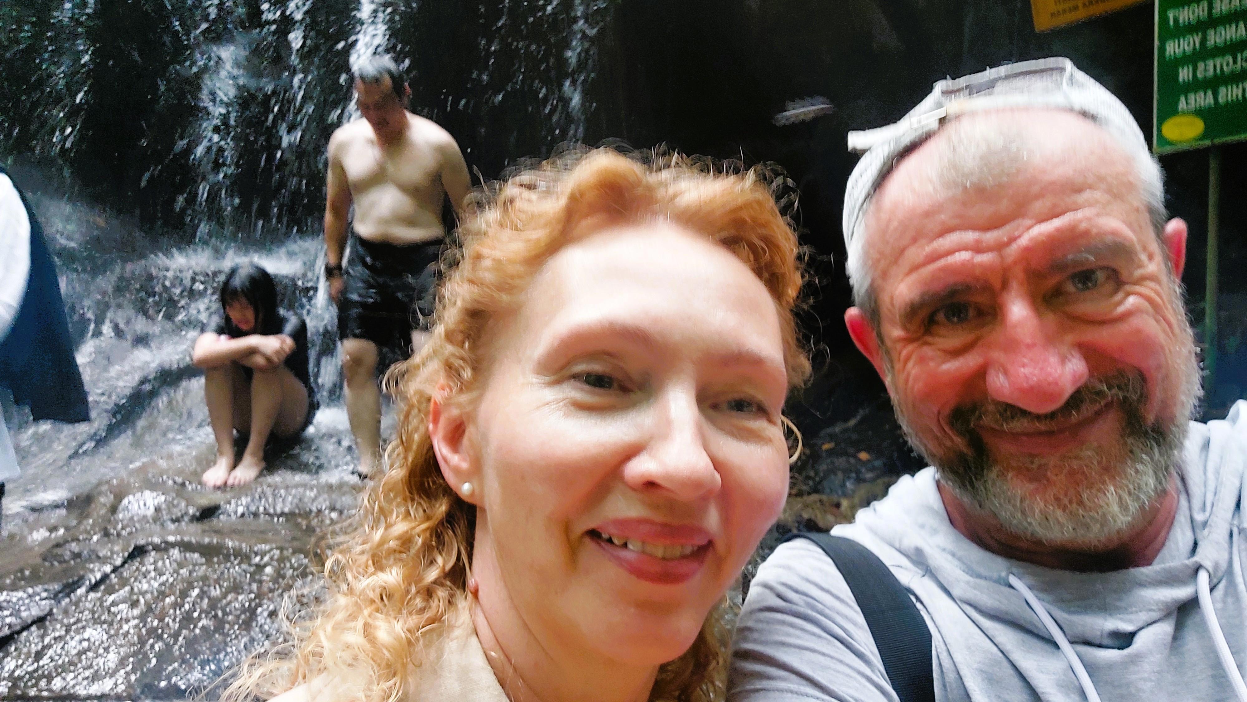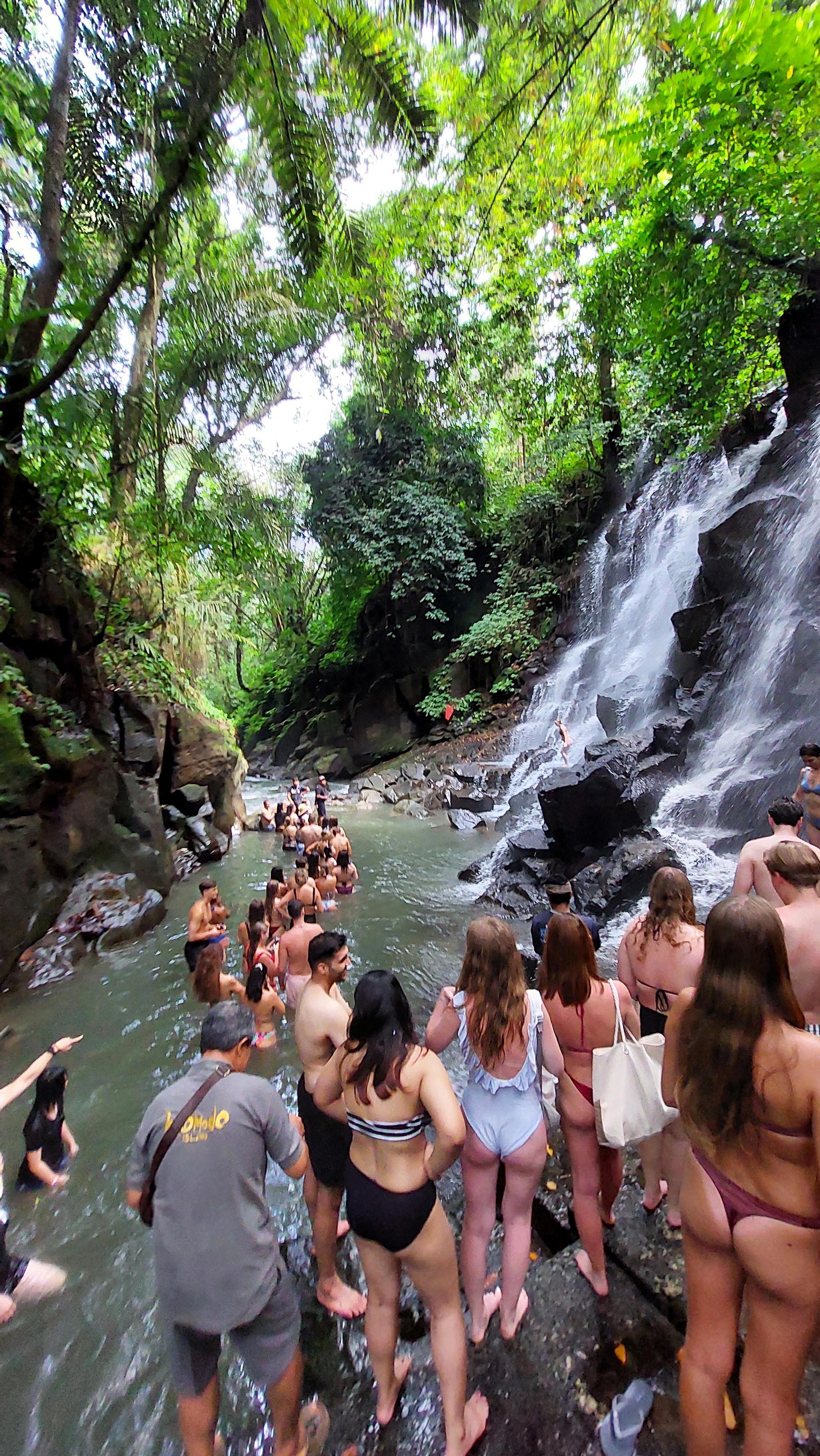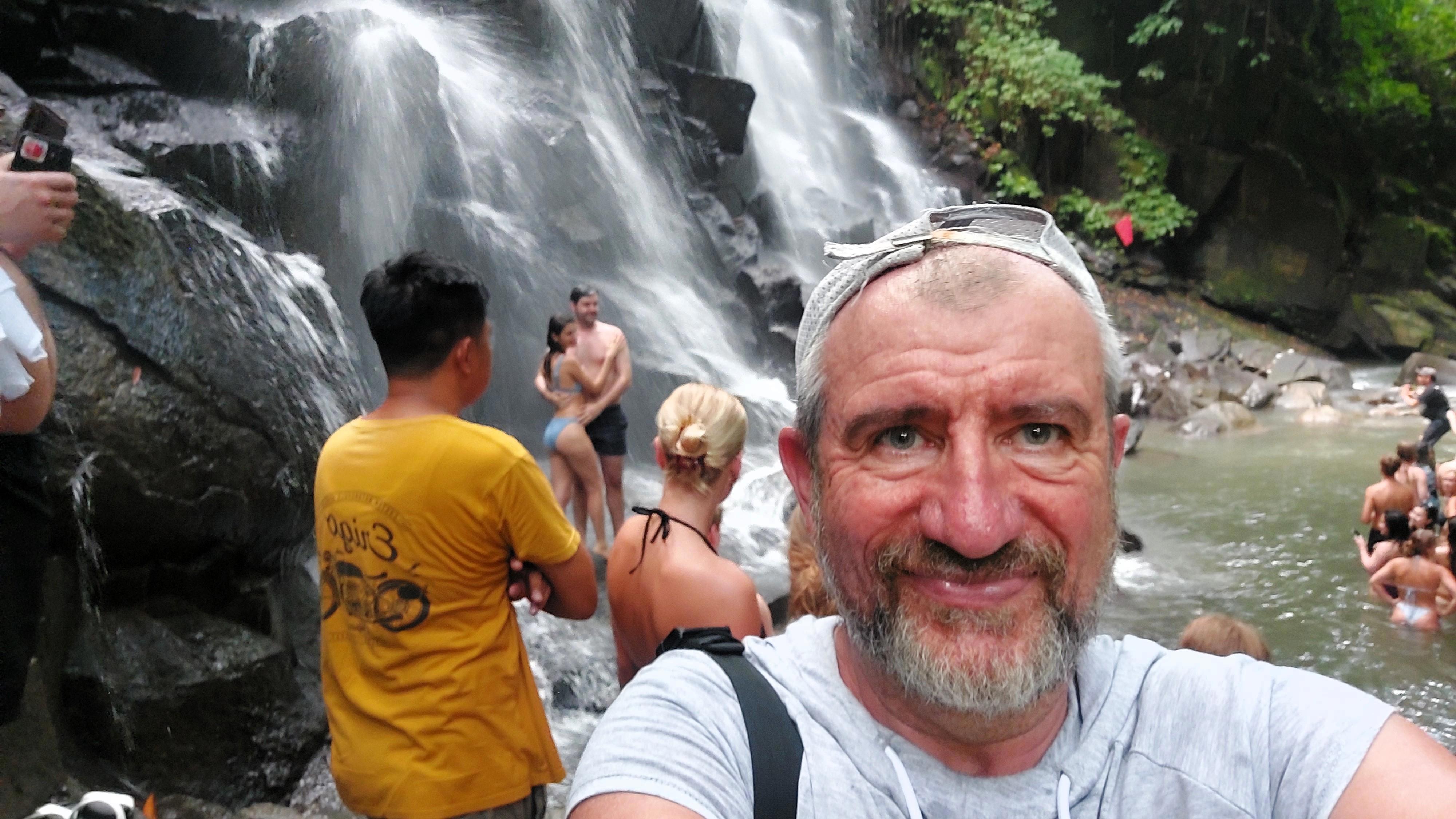 Дошли до самого водопада. Вне всякого сомнения, место красивое, падающая вода, река в ущелье, но некую сакральность нарушают толпы людей, кто просто поглазеть, кто выстроился в реке в очередь на окунуться под падающую воду, а кто сделать эффектный снимок в купальнике на фоне разлетающихся брызг. Мы в категории поглазеть и пофоткаться, под воду из-за раны на локте нельзя, могу занести кучу бактерий. Ну и ладно.