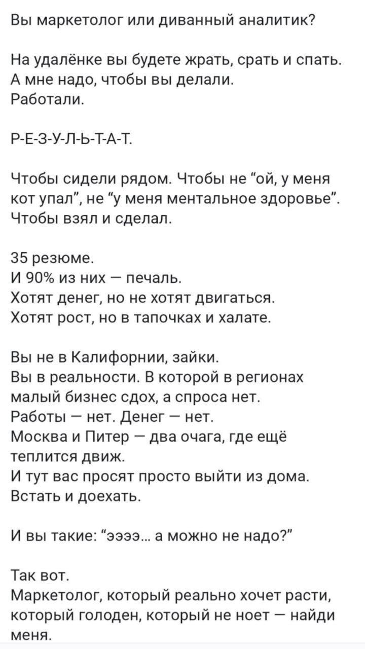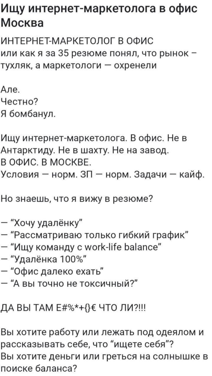 Автор: Наталья ВемЗавирусился тут один пост. Работодатель ищет маркетолога в офис и бомбит со спецов, которые хотят работать на удалёнке.