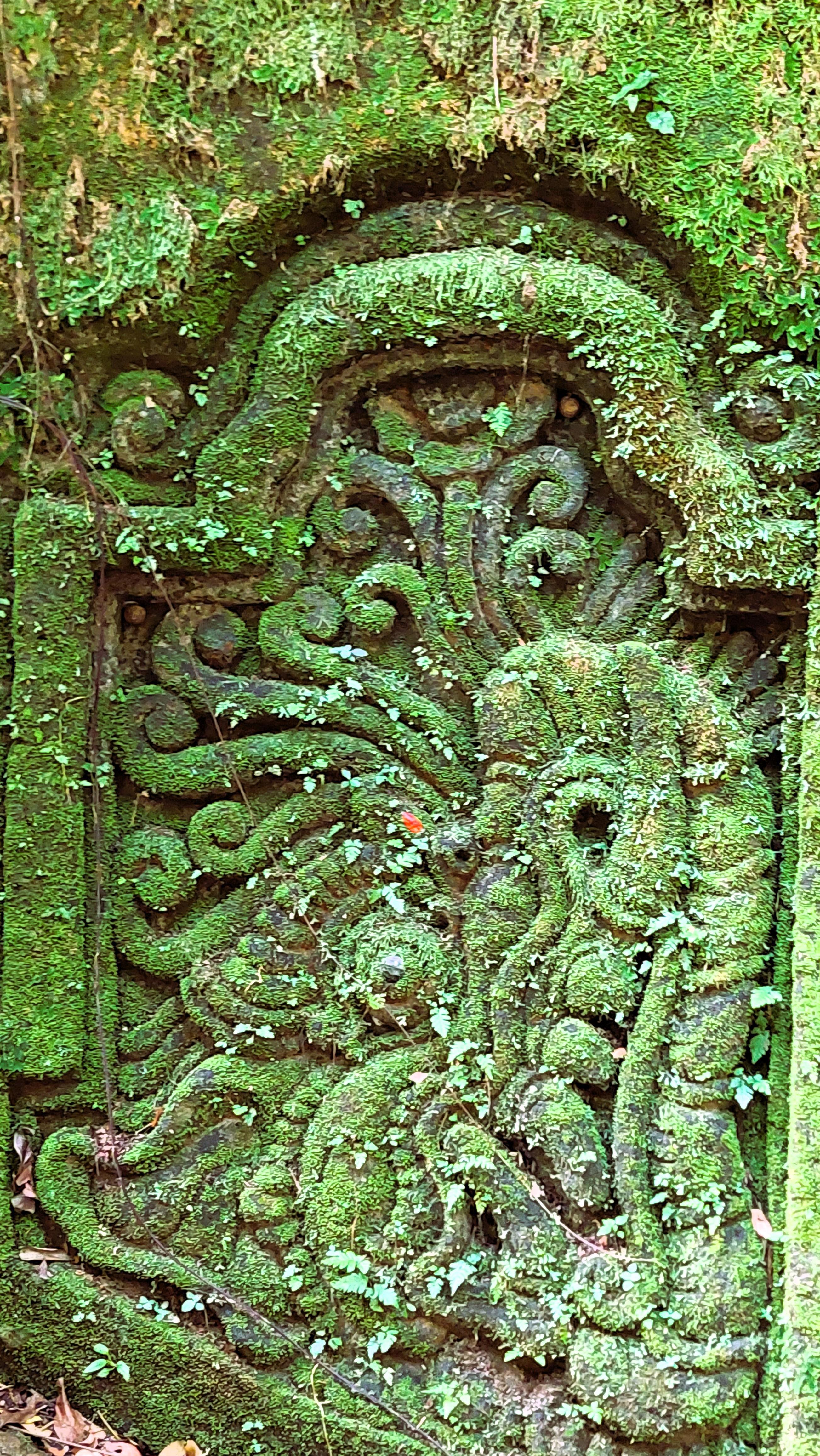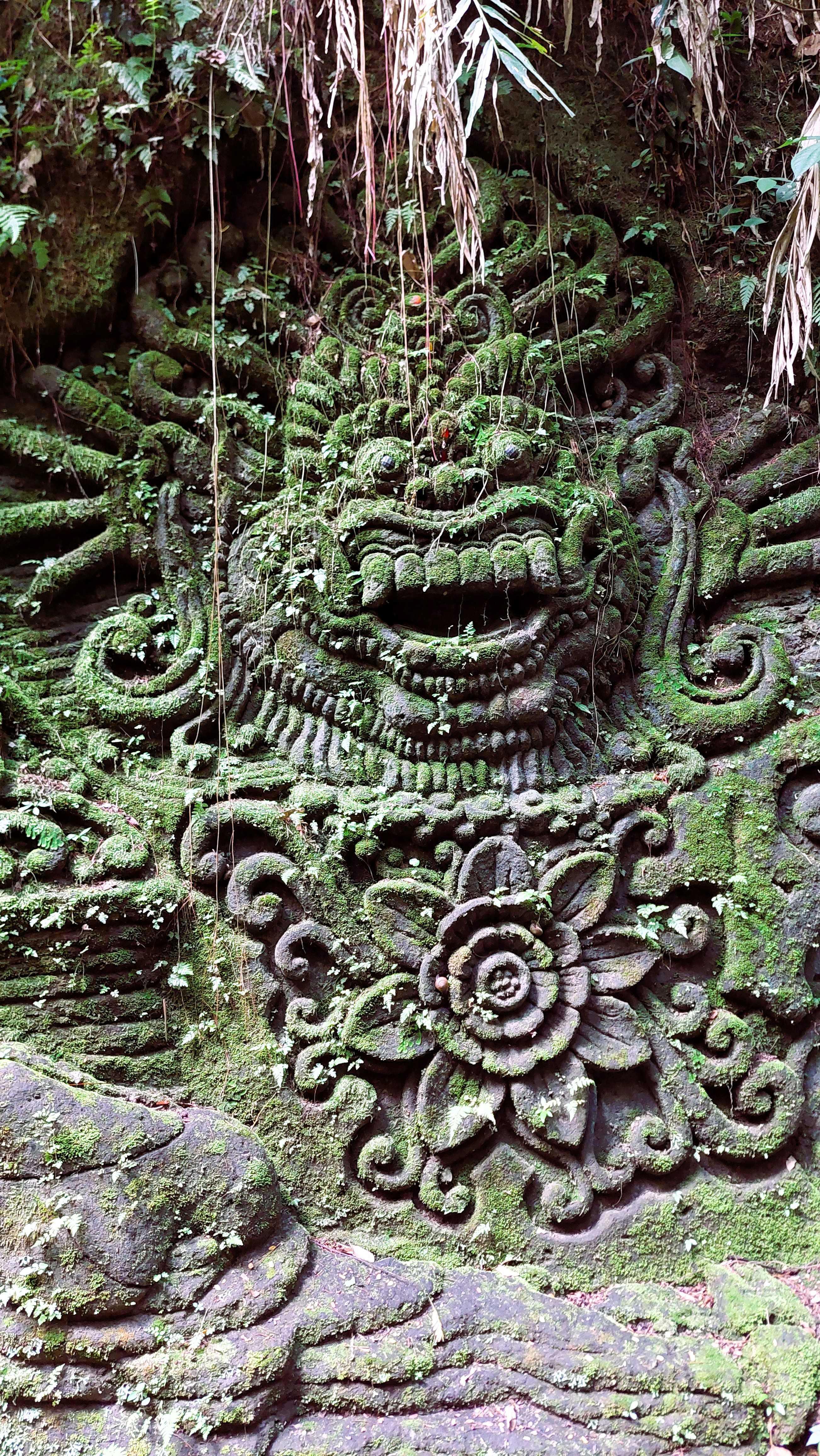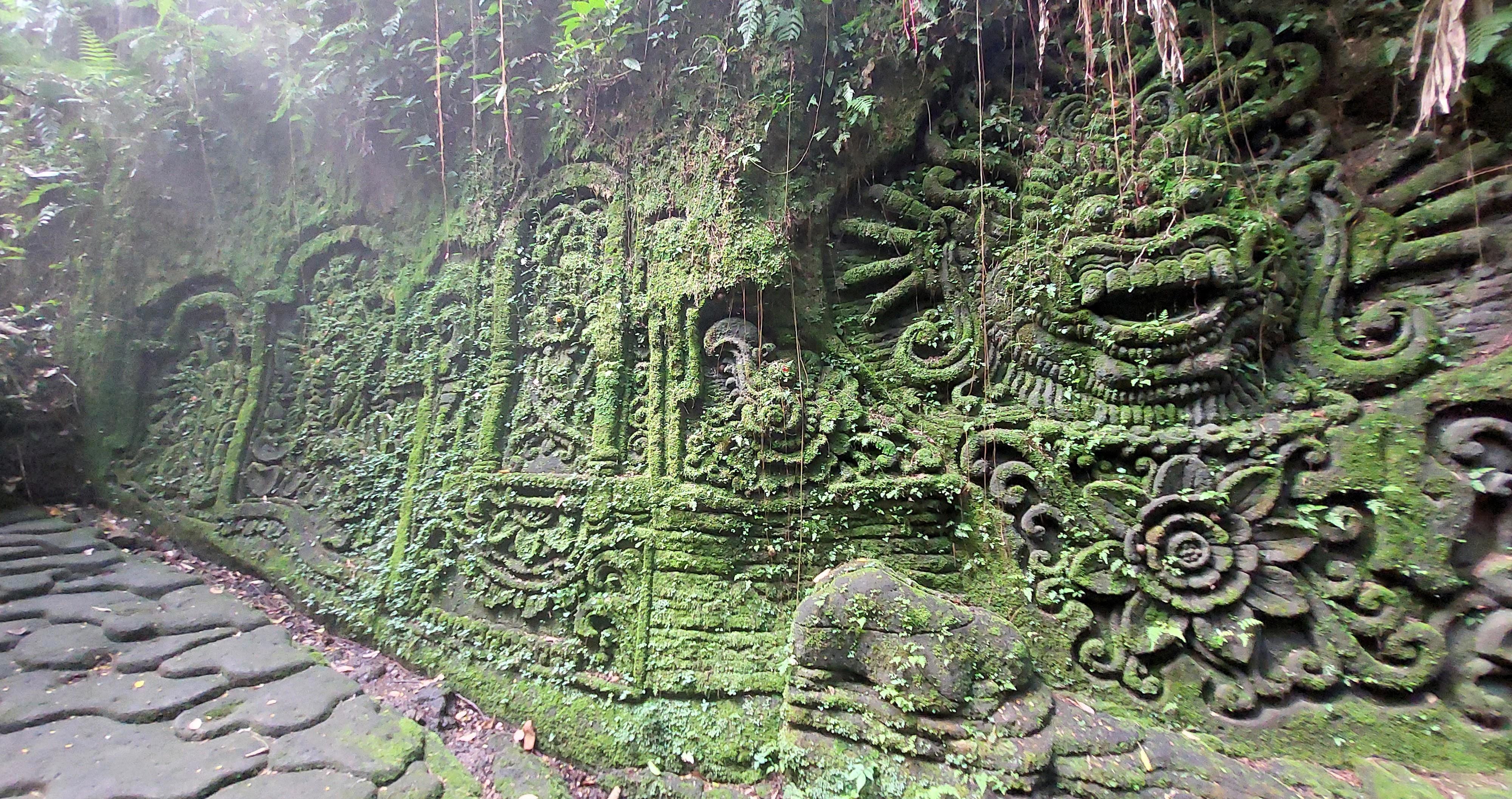Глаза Баронга, обезьяны и другие лица таинственно мерцают отблесками цветных камней. Мох, покрывший стены, придаёт ощущение древности. Обворожительное место. И главное, мы здесь одни, время словно замерло, и кажется, что вот сейчас из-за поворота выбежит индеец мая, но нет, выскочила снимающая себя китаянка.