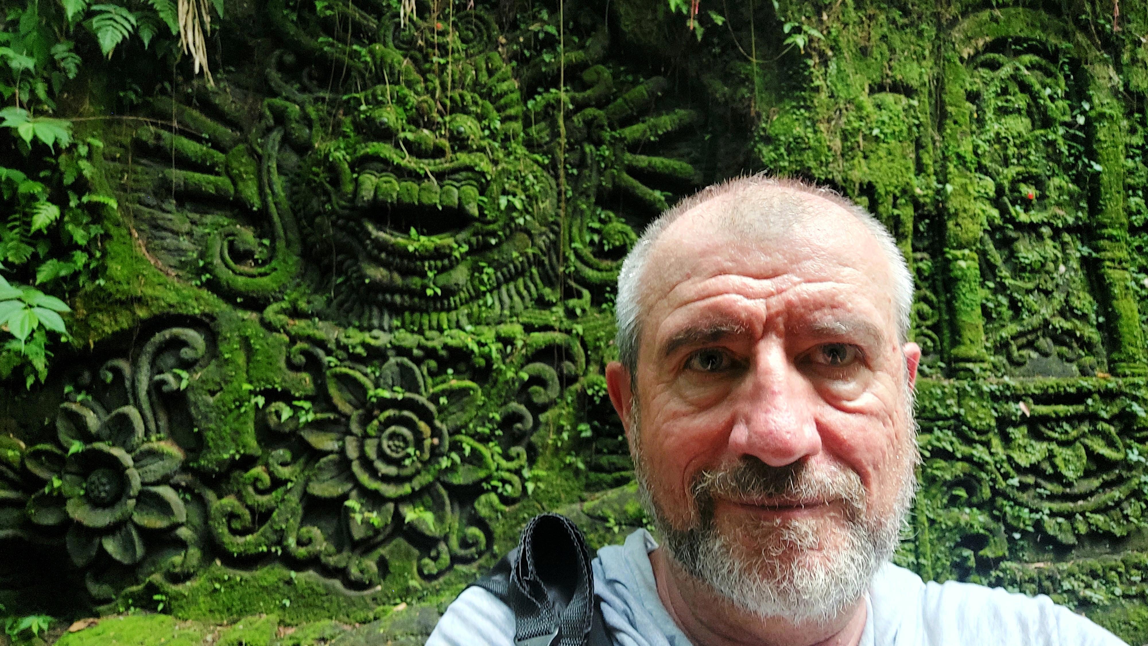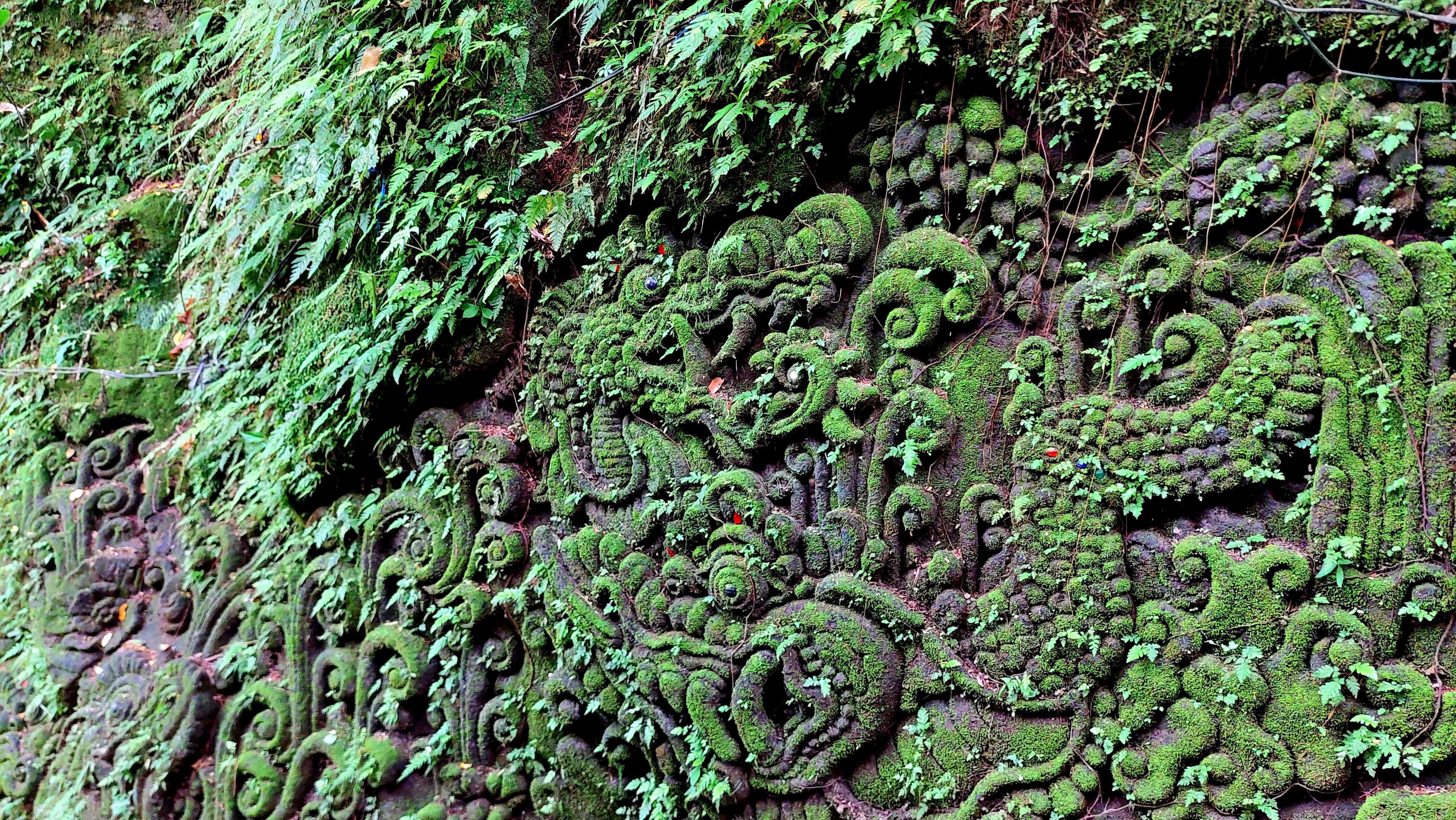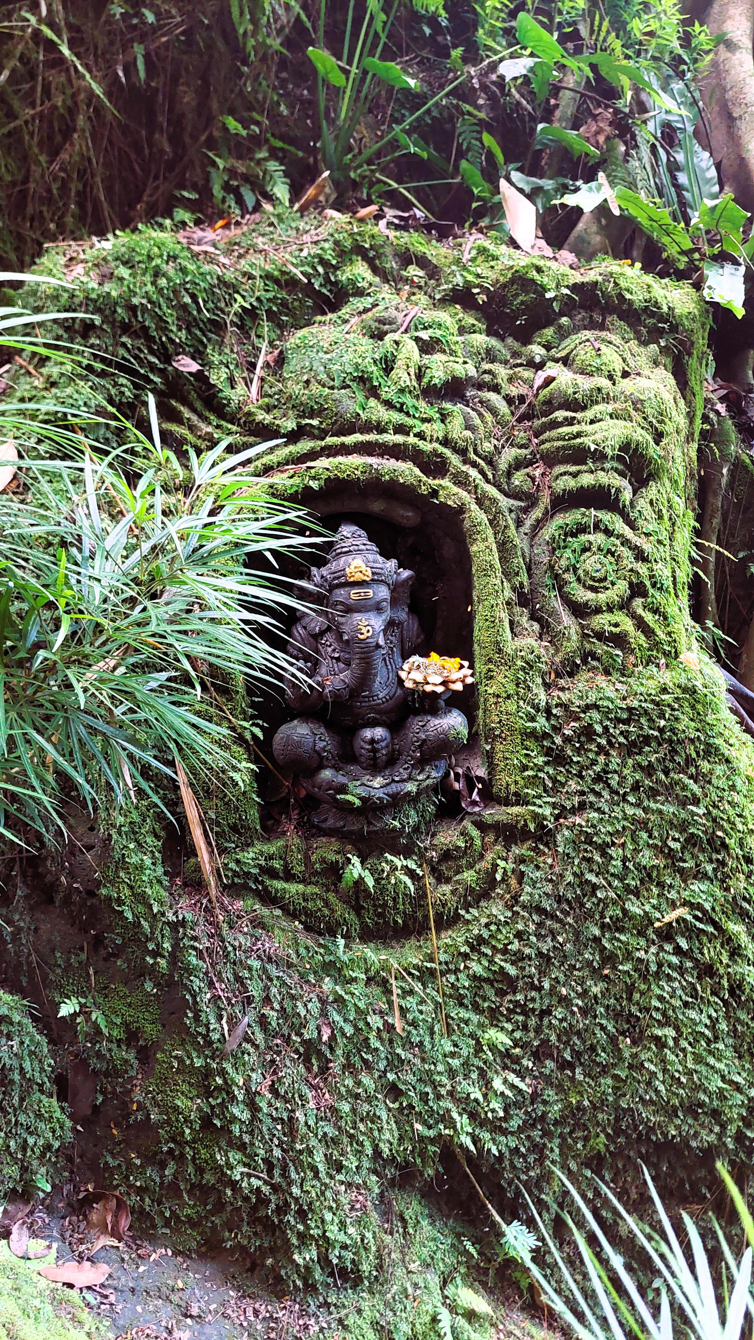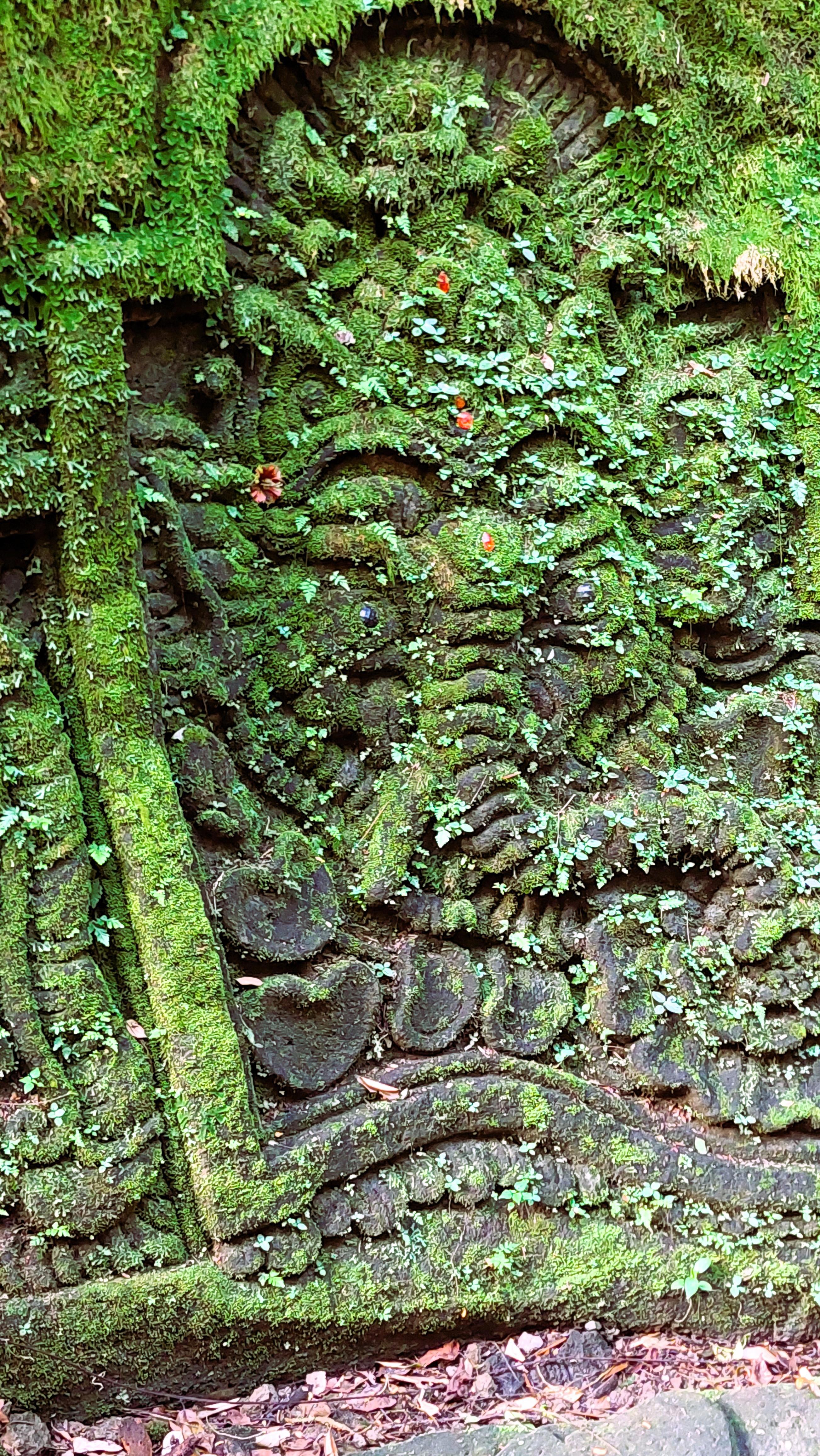 Глаза Баронга, обезьяны и другие лица таинственно мерцают отблесками цветных камней. Мох, покрывший стены, придаёт ощущение древности. Обворожительное место. И главное, мы здесь одни, время словно замерло, и кажется, что вот сейчас из-за поворота выбежит индеец мая, но нет, выскочила снимающая себя китаянка.