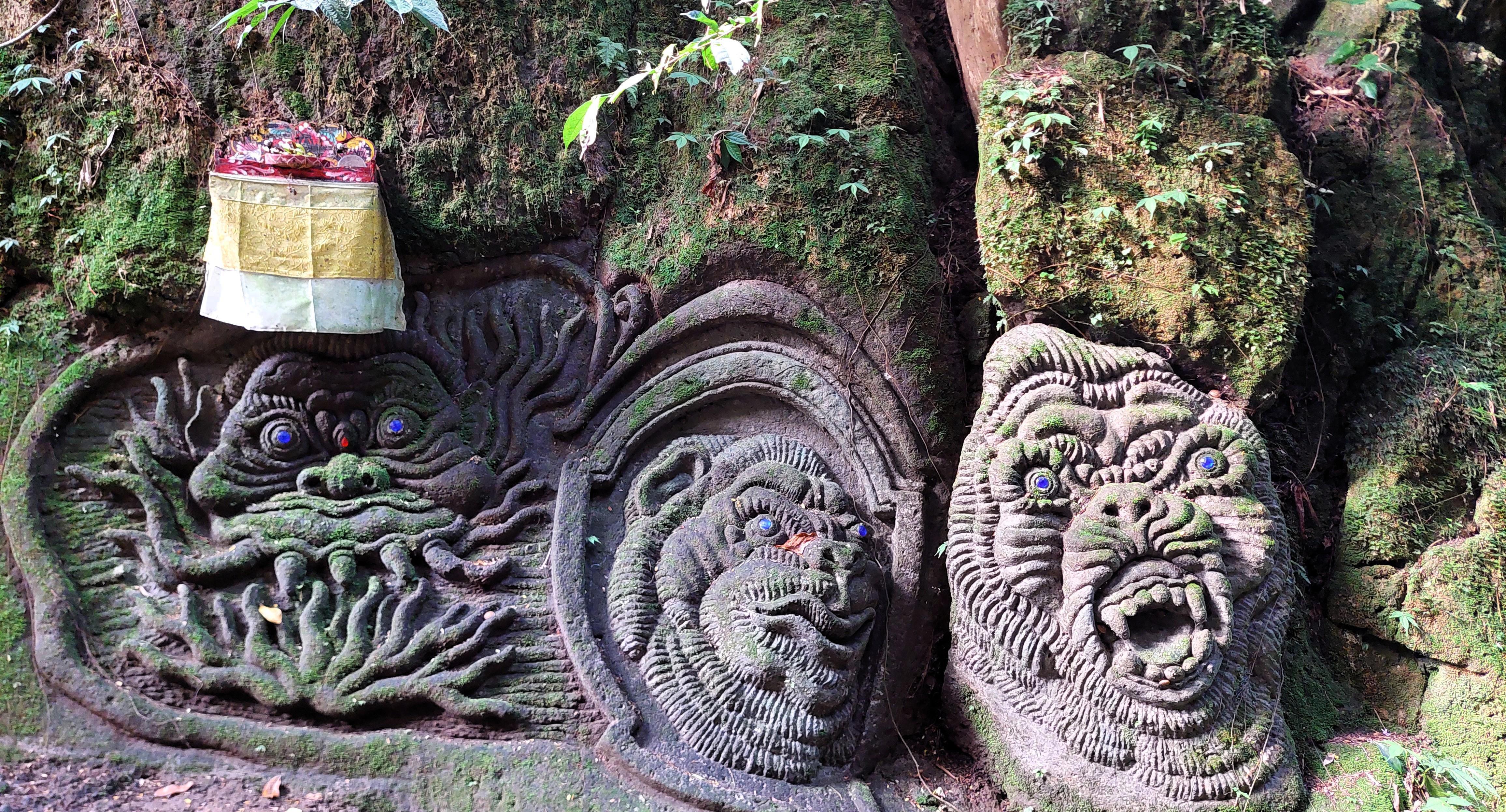 и уходящая в небольшой проход в горе, и, главное, высеченные на стенах лица, морды, фигуры, орнаменты.