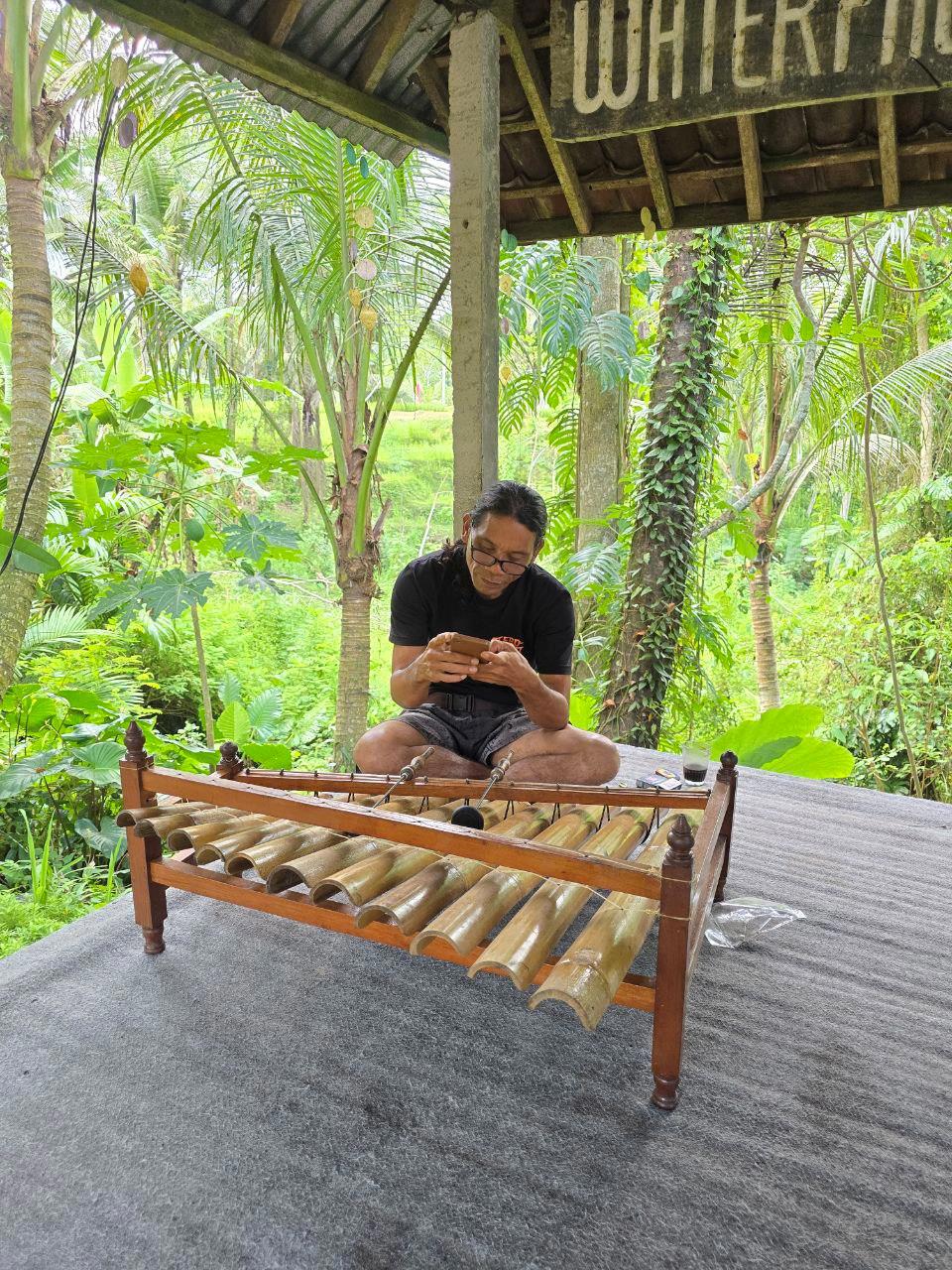 Спросил у Саши, как будем заезжать, на что он указал на паренька с рацией, сидящего в беседке, оказывается такой же чел сидит внизу и согласуют движение. Прикольно. Просторная стоянка, засыпанная гравием. В беседке несколько парней, один из них с рацией, другой играет на балийском риндике, остальные бездельники явно за компанию.