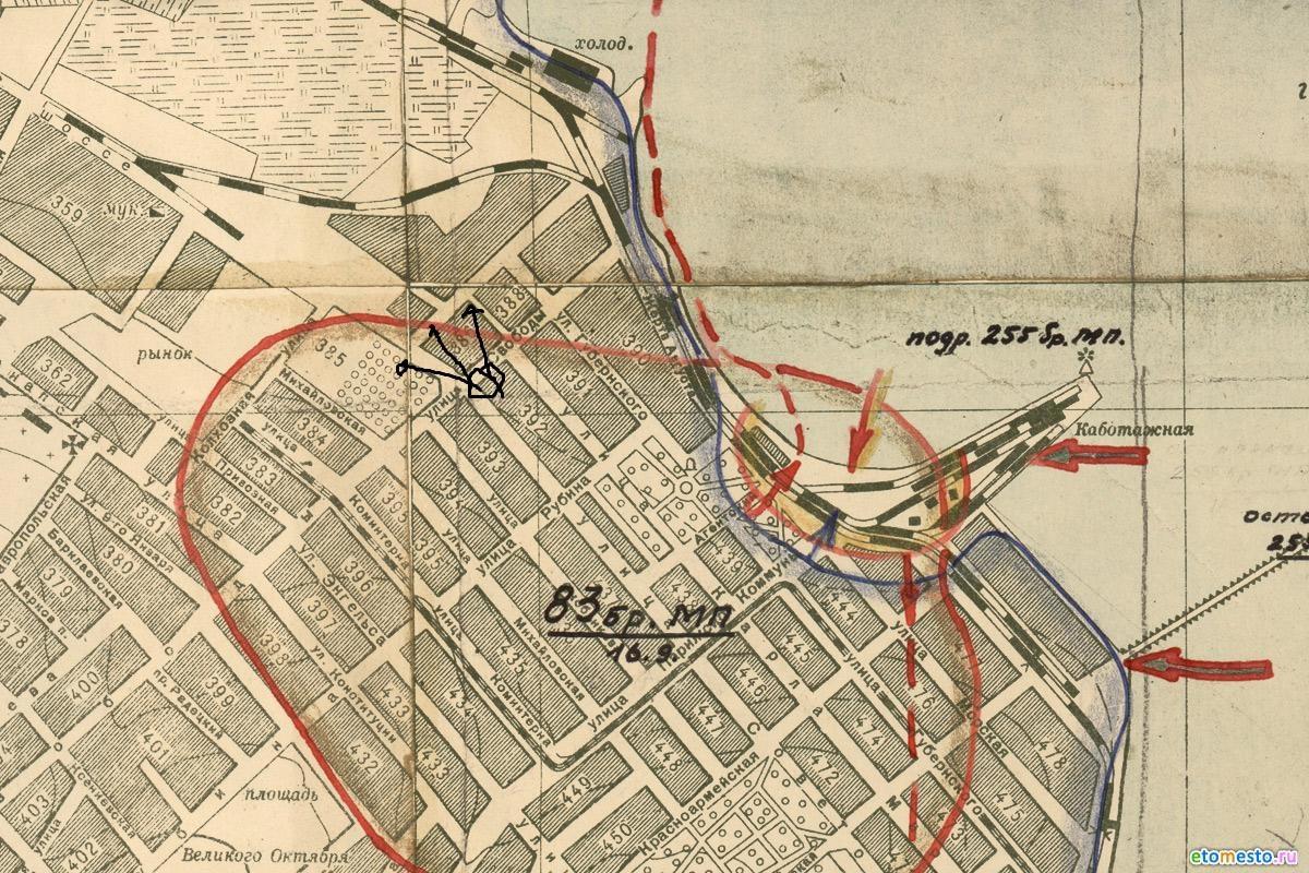 В боях за Новороссийск в 1942м году немцы наступали с севера на город,то есть по карте от рынка,квартала 359 и т.д.