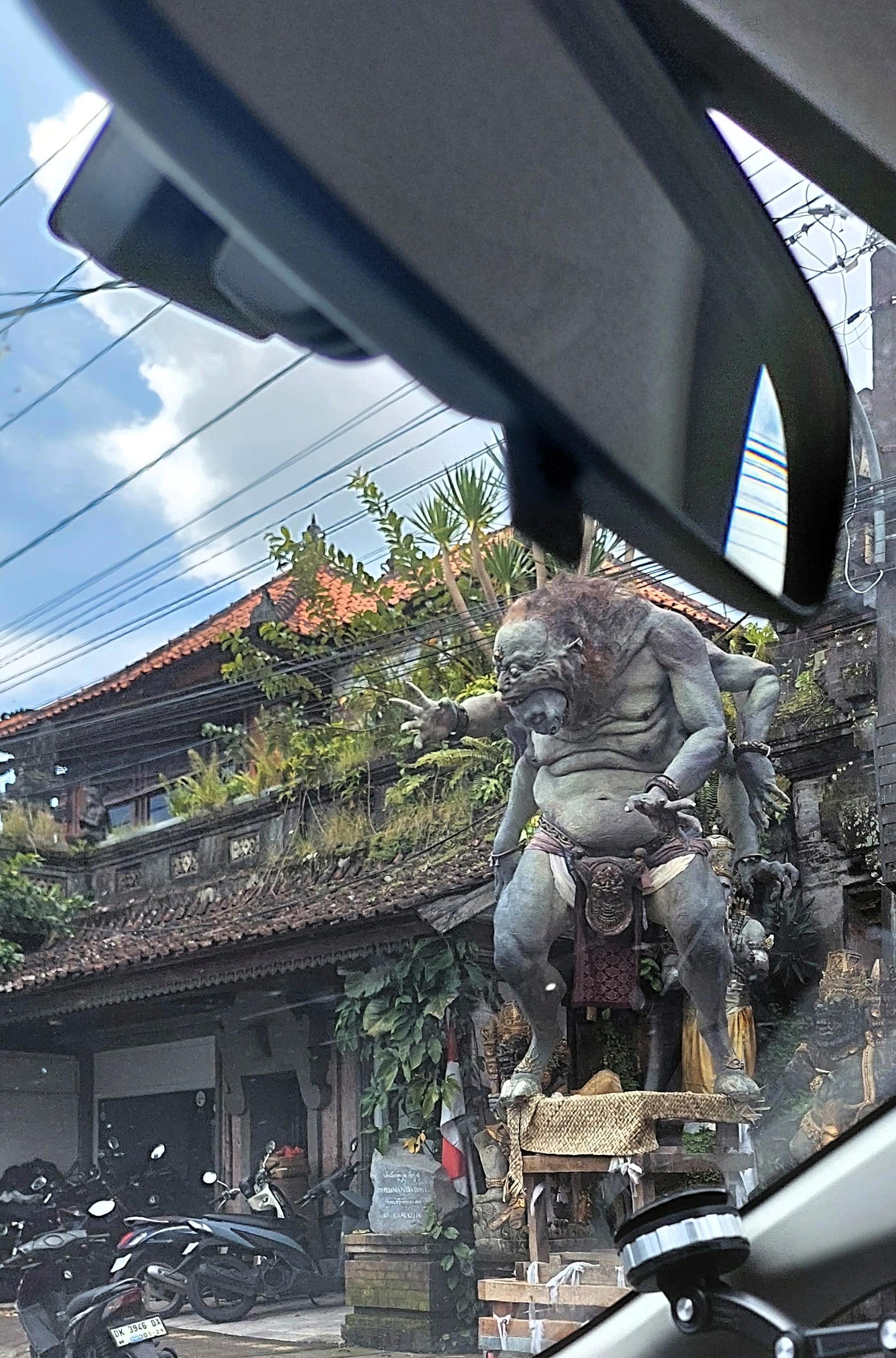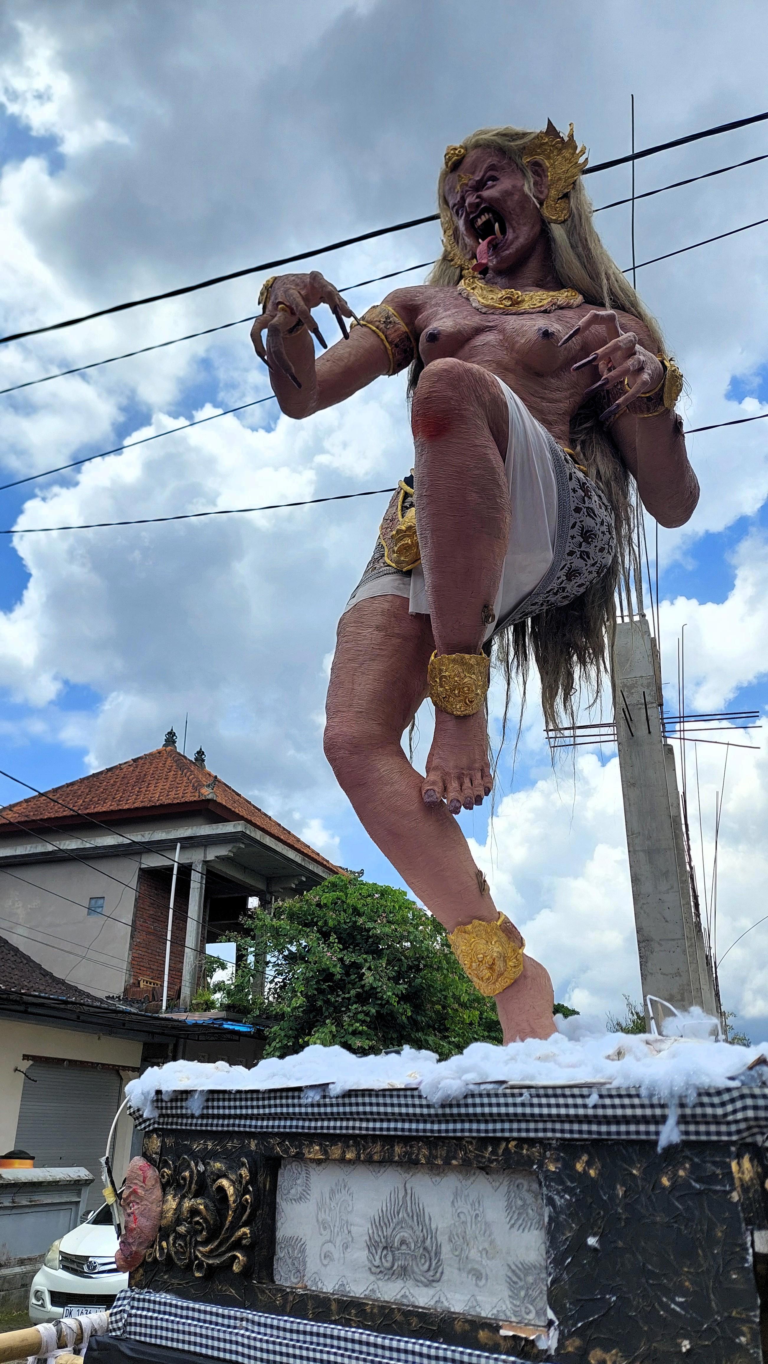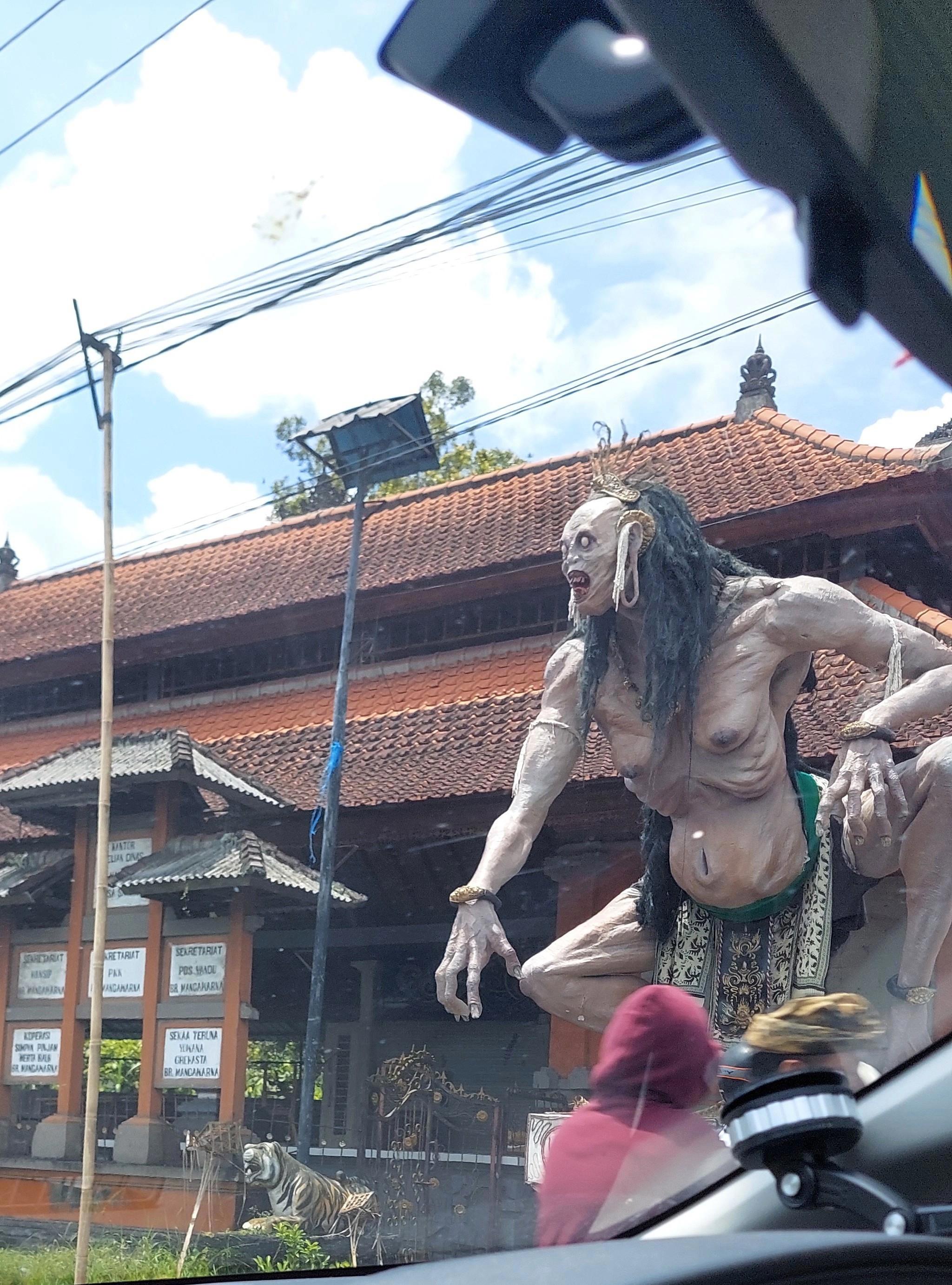 Периодически вдоль улиц попадаются фигуры Ого-ого, которые по идеи должны были сжечь, но нет, выставляют на показ. Напомню, далее из вики: «Ого́-ого́ (бал. ogoh-ogoh) — это скульптуры из папье-маше, как правило намного выше человеческого роста, изготавливаемые для шествия накануне дня Ньепи на Бали в Индонезии…Ого-ого обычно имеют форму мифологических существ, в основном злых духов как олицетворение пороков, которые необходимо держать подальше от жизни людей. Участники шествия несут ого-ого колонной, иногда встряхивая их, чтобы казалось, что те движутся или танцуют» и вообще оказалось: «Ого-ого совсем недавно стали частью подготовки ко дню Ньепи. Впервые они повывелись в Денпасаре в начале 1980-х годов».