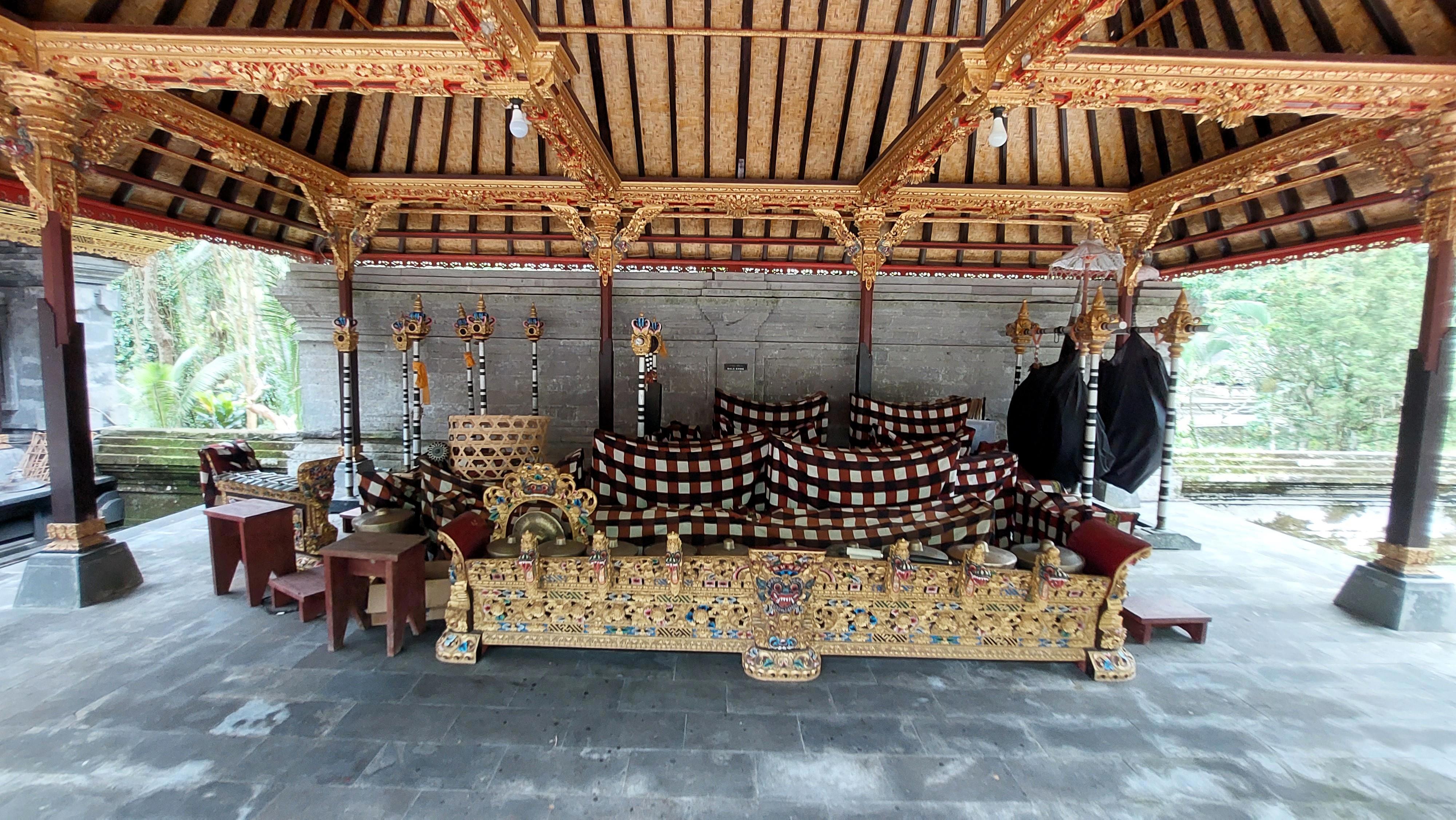 Как узнал из интернета, обычно территории храмов закрыты для посещения туристам. Но для этого сделали исключения. Фотографирую объекты, назначения не понятны, но выглядит всё атмосферно. Большая беседка без ограждения, на полу расположенны инструменны для ансамбля Гамелан. (Гамелан представляет собой комбинацию нескольких традиционных индонезийских музыкальных инструментов).