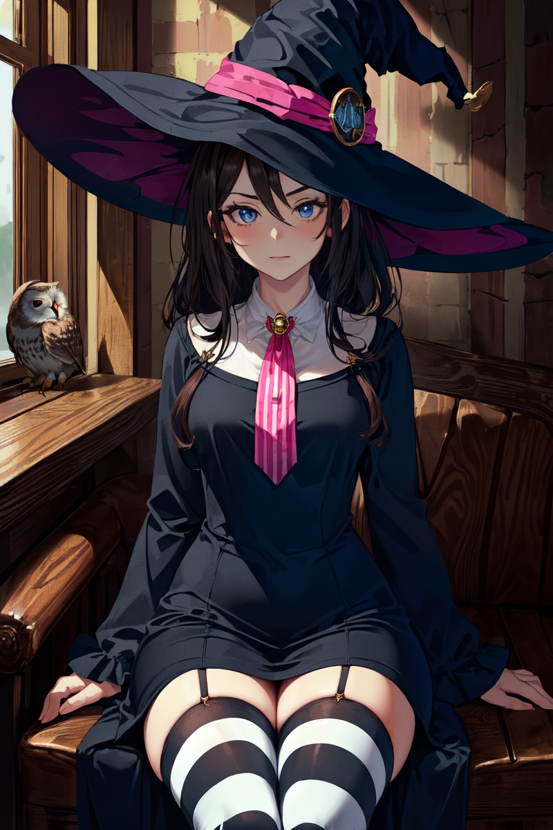 Одета в темное платье и конусовидную шляпу с широкими полями, а также стильные сапожки и черно-белые чулки.