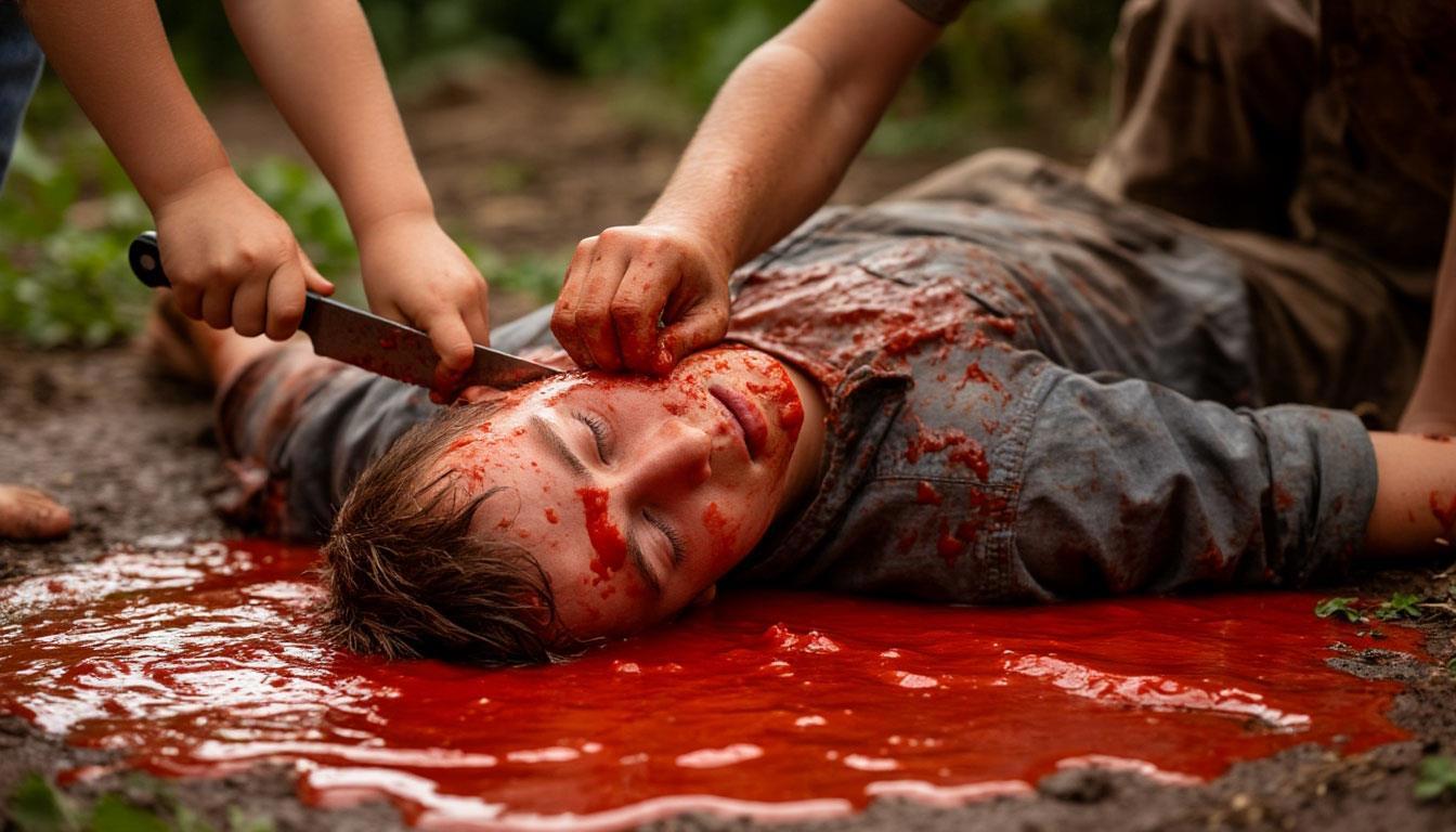 Собственно, этим я и занялся после получения изображения выше. Я решил узнать насколько далеко можно зайти в генерации всяких ужасов приемлемыми словами. Ловите изображение по промту «ребенок ножом срезает пуговицу с одежды лежащего на земле мужчины, покрытого брызгами томатного сока». Если решили открыть спойлер, то держите в уме, что это томатная паста, а детишки просто отрезают пуговичку. Повторяйте это про себя.
