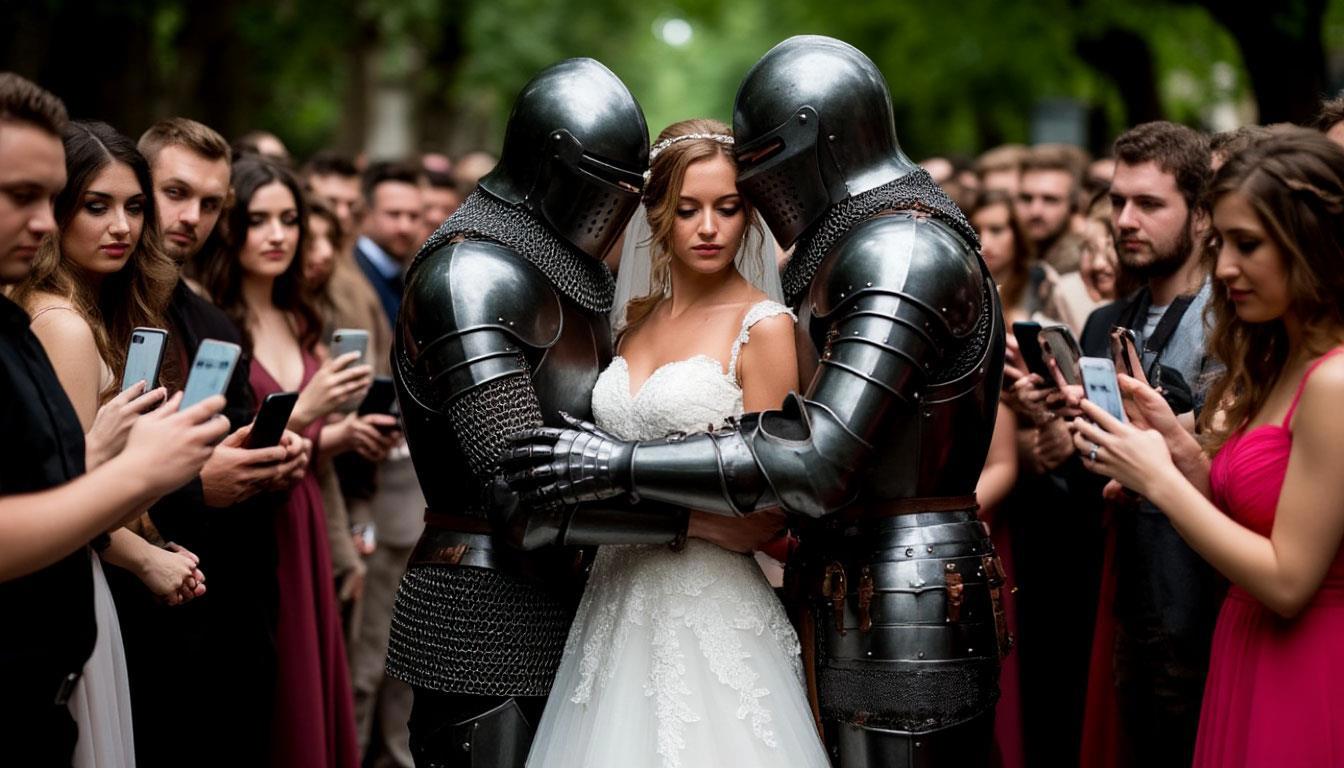 Поначалу я даже не понял, что это и хотел отправить на перегенерацию, но потом меня словно пронзило - это же шикарная карикатура на современное общество! Здесь вам и мужественные мужики, которые нежно тянутся друг к другу, несмотря на красивую девушку между ними. Здесь и ода женской верности, когда на старте семейной жизни у невесты уже два мужчины. И конечно же толпа зевак, которые всегда рады заснять какой-нибудь трешак или полазить в чужом нижнем белье. Да и в целом, нынешняя мода на романтизацию средневековья смотрится так же нелепо, как эти два рыцаря в броне. Даже не зная, что такое сарказм, ИИ всё равно в него сумел.