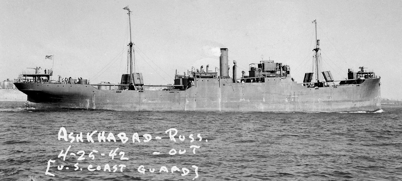 Апрель 1942 года. Сухогруз «Ашхабад» в составе QP-9 добрался до Исландии, прошёл Атлантику до американского побережья и при переходе от Нью-Йорка до Кубы получил торпеду в борт с немецкой подводной лодки. В этой зоне транспорты тогда ходили ещё без конвоя. В зоне прямой видимости на мелководье торчали из воды верхушки мачт погибших кораблей. Видно было, что это не первое убийство фашистских подводников. Моряки с тонущего «Ашхабада» бросились… нет, не к шлюпкам. Сначала к пушкам! Треск ломающихся переборок. Затапливаются отсеки один за другим. Судно быстро погружается кормой в воду. Крен. Они успели сделать три выстрела из носового орудия и заставили лодку уйти. Всё происходит очень быстро. Тонущее судно заметили лётчики с американского самолёта. Капитан Яскевич отдал команду спустить шлюпки. Все 36 человек экипажа благополучно покинули тонущее судно и разместились в шлюпках, прихватив с собой пулемёты. Ведь подводная лодка могла вернуться и её нужно было встретить, как положено у советских моряков. Вскоре экипаж «Ашхабада» принял на борт подоспевший английский тральщик. Вот на этом судне плавали герои. Это – «Ашхабад»:
