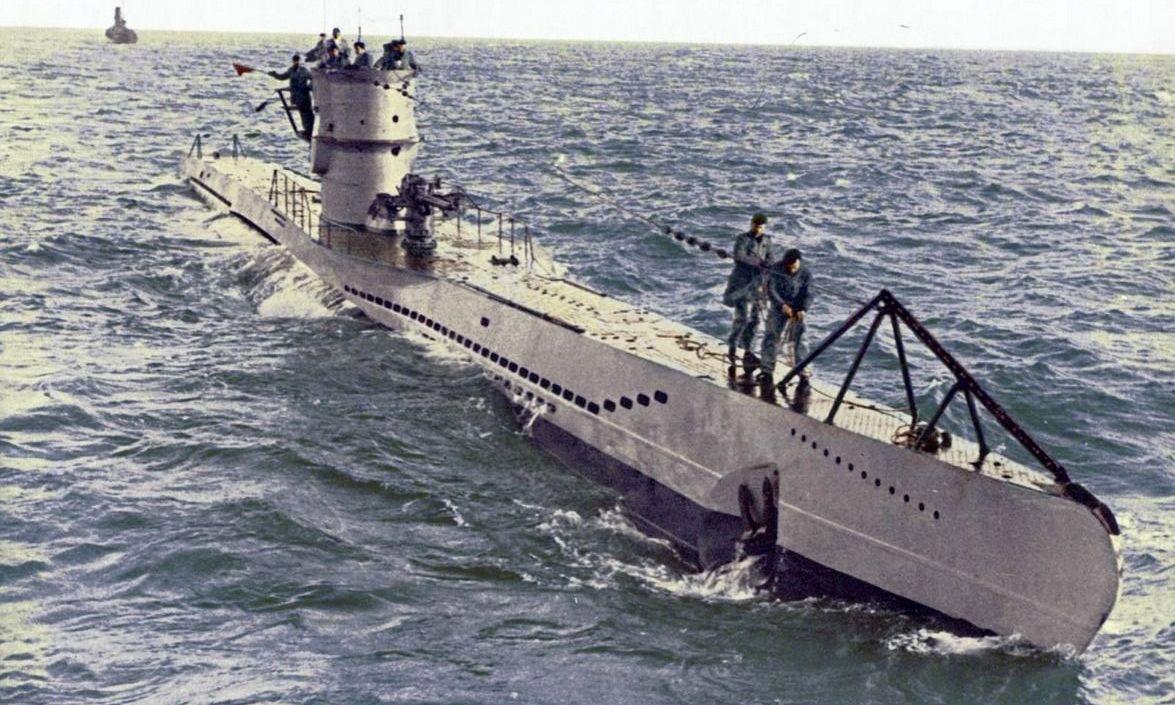 Лодка скрылась из виду. Через несколько минут боцман Ф. Ксенофонтов доложил с бака: «Слева по носу торпеда.» Бой начался. Полный ход. Уклонение. Крен на циркуляции. Торпеда проходит мимо в десяти метрах от борта. Но в этот момент обнаруживают вторую – она идёт в корму. Снова уклонение. Струя от винтов отбрасывает её в сторону. Через несколько минут примерно в восьмистах метрах от сухогруза наблюдатели обнаруживают всплывшую подводную лодку. Вот такую, примерно:
