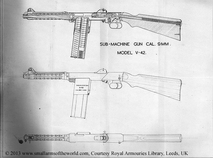 Первый вариант пистолета-пулемета своей конструкции он послал главному инспектору по стрелковому оружию еще в 1940 году. Вряд ли в тот момент кто-то внимательно заглянул в присланные бумаги – в тот момент шла лихорадочная работа по развертыванию производства пистолета-пулемета "ланчестер" и всем было не до "какого-то там чеха". Но Йозеф оказался человеком упрямым и спустя два года принес на рассмотрение уже сделанный "в железе" прототип. К человеку с оружием чиновники отнеслись более внимательно, чем к чудаку с какими-то бумажками, организовав испытания на королевском оружейном заводе в Энфильде. Увы, результаты испытаний для образца, получившего наименование V42, были не очень удачны – он провалил тест на загрязнение. Тем не менее, когда в 1944 году британцы озаботились поиском нового оружия для десантных частей, Весели снова решил попытать счастья. Компания VAP Holdings Ltd изготовила шесть образцов пистолета-пулемета.