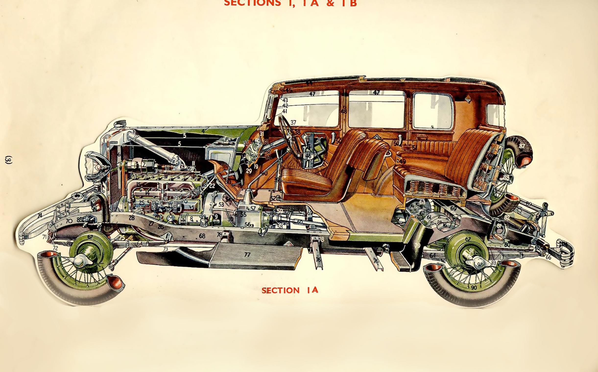 Автомобиль конца 20-х в разрезе. Обратите внимание - кабина не цельнометаллическая, а обшита стальным листом по деревянному каркасу. Эта технология в Европе применялась до 50-х годов. Цельнометаллические корпуса появились в США только в 30-х, начав постепенно вытеснять старую технологию