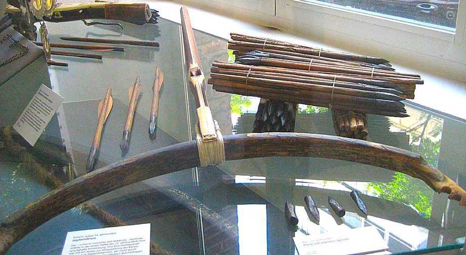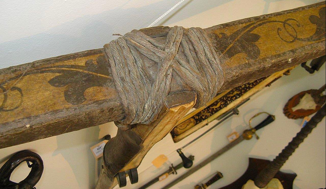 Конкретно это - деревянная дуга с роговым усилением относительно раннего арбалета. Здесь можно видеть наиболее распространенный тип крепления - примотка шнуром.