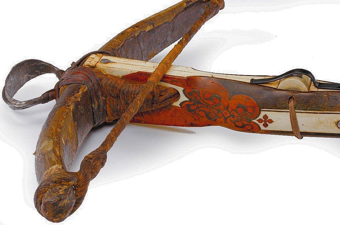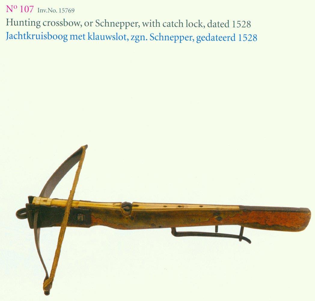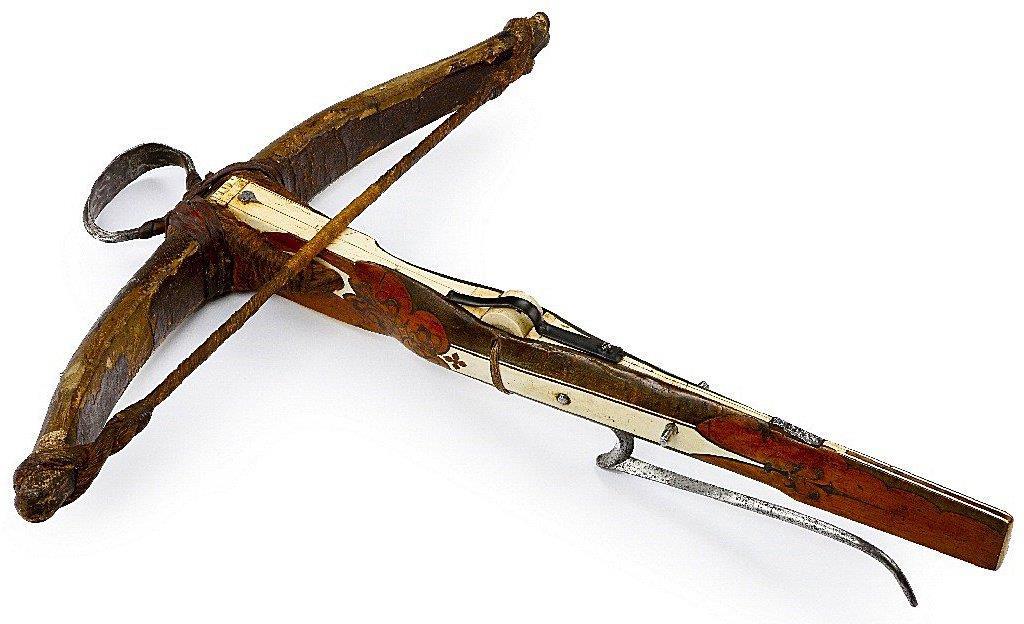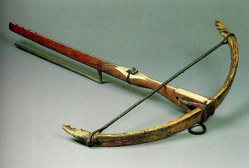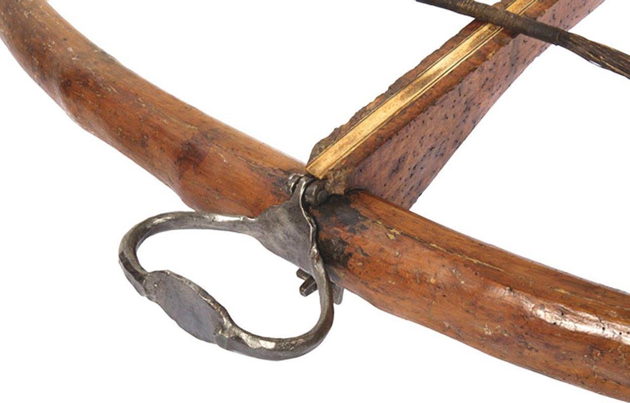 Вторая половина 15 века, арбалет с композитной дугой, прижимной планкой и штифтом в ложе для крепления краникена. Видно, как приматывалась дуга и насколько она была толстой.