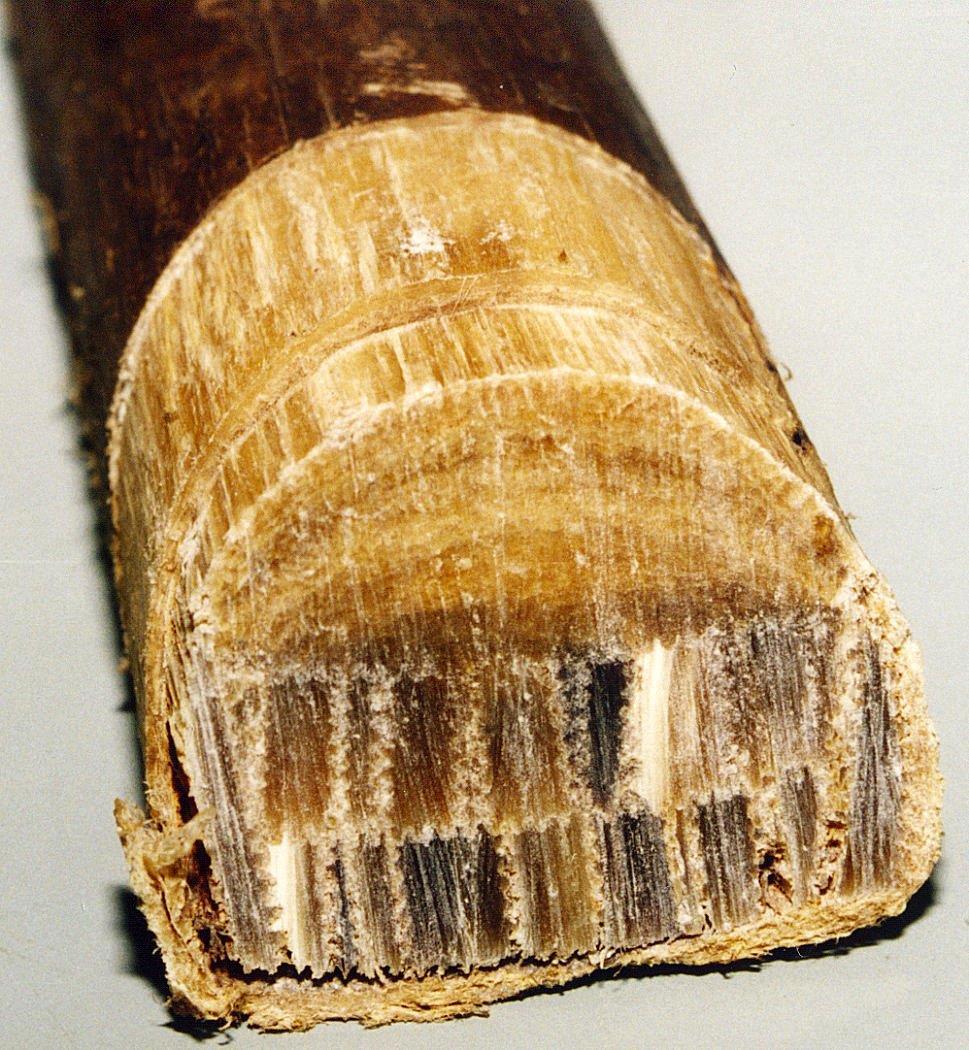 Вот разрез композитной дуги арбалета середины 15 века. Веком раньше дуги были действительно композитные и могли содержать дерево. Здесь только рог - обратите внимание, как тщательно подогнаны роговые пластинки.
